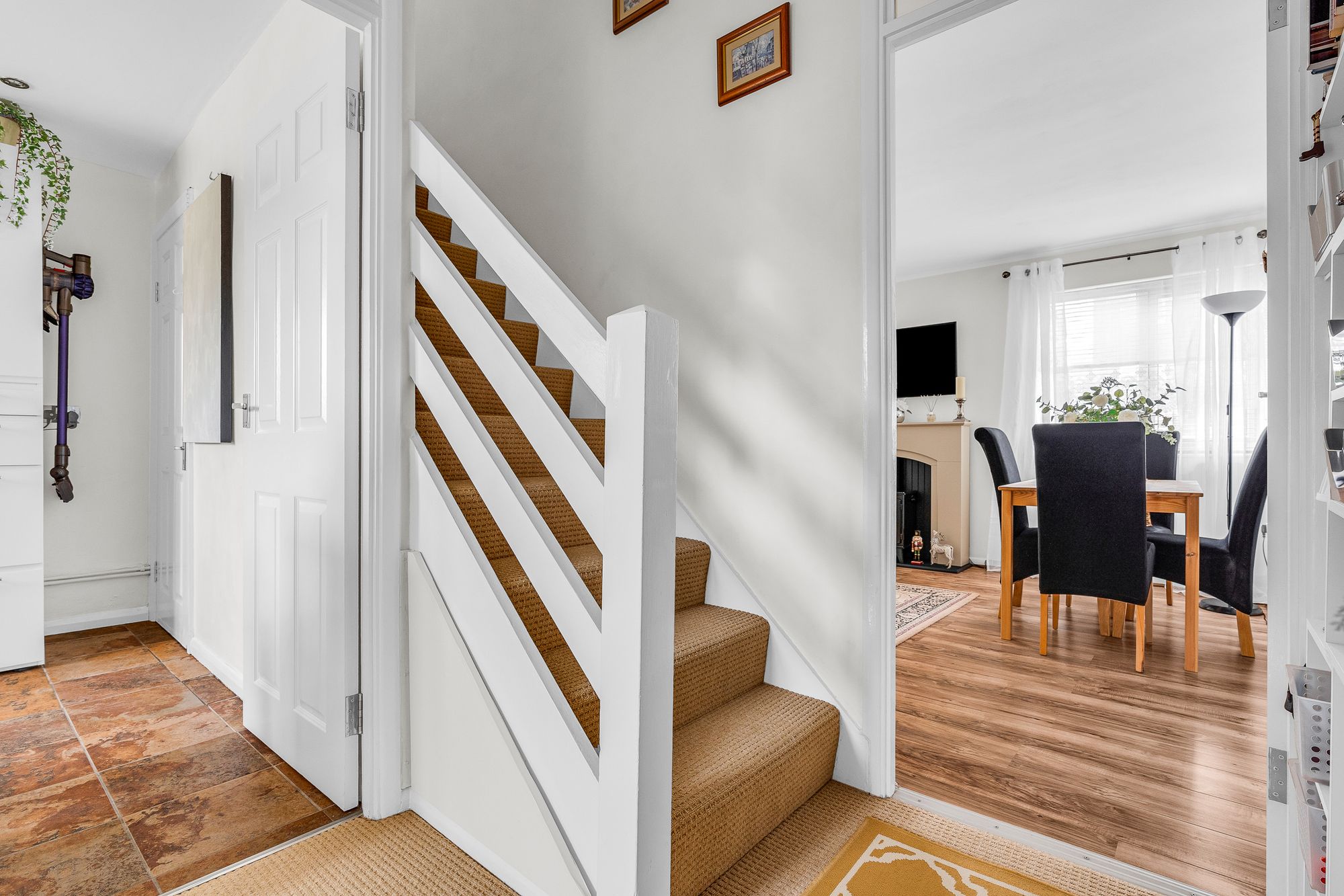 With stairs to second floor landing and doors to: