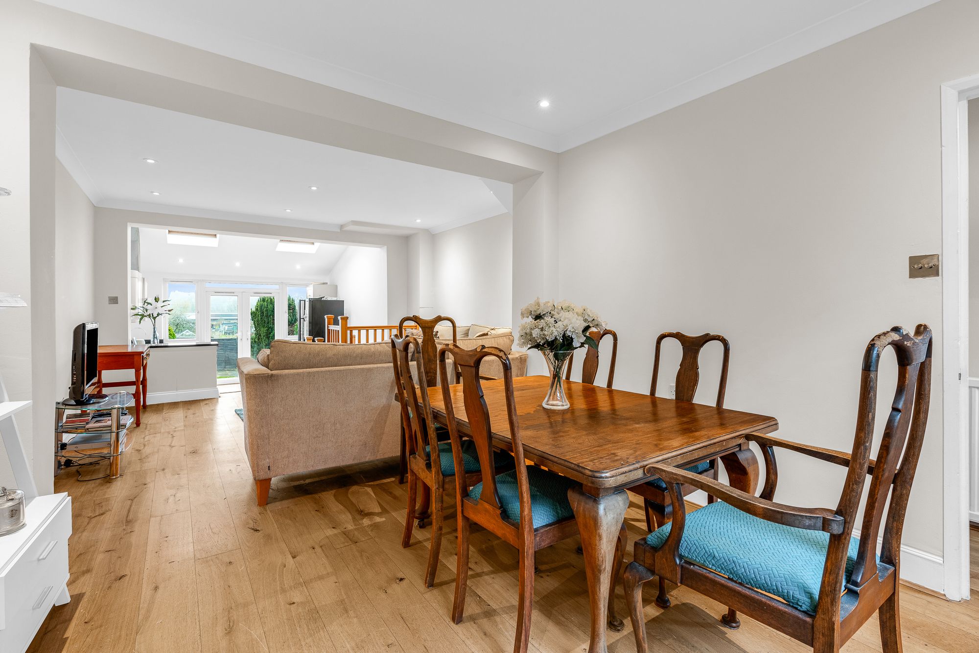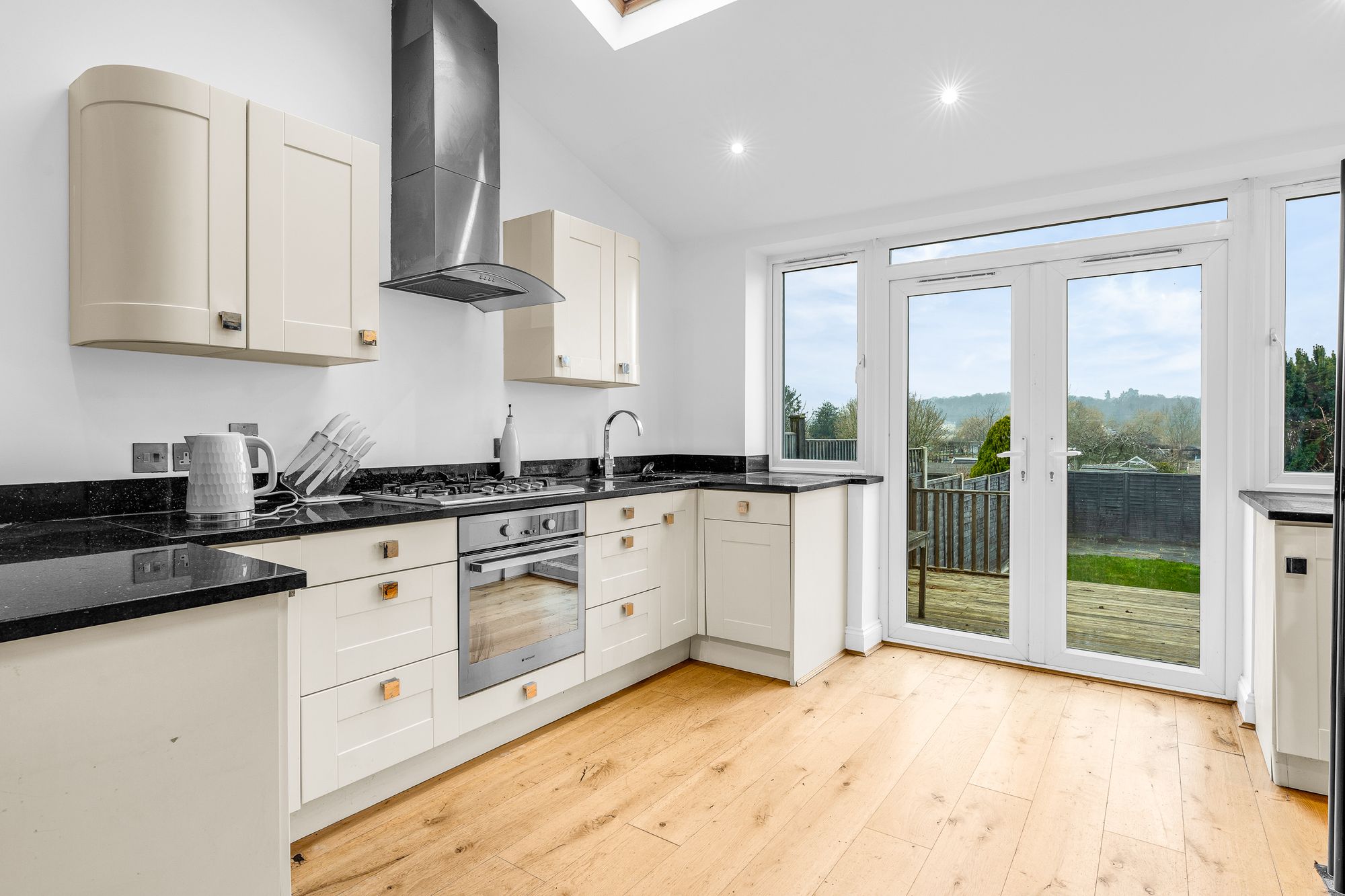 With double glazed double doors opening onto the rear garden and two skylight windows. Fitted with a range of wall and base storage units with work surfaces over incorporating a sink and drainer unit, integrated appliances, space for American style fridge/freezer, wood flooring, stairs to: