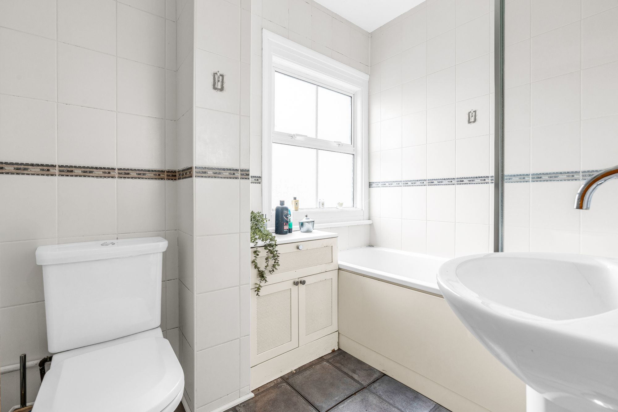 With double glazed sash style window to rear aspect with obscure glass. Fitted with a suite comprising panel enclosed bath with shower over and glass shower screen, pedestal wash hand basin, dual flush wc, fully tiled, radiator.