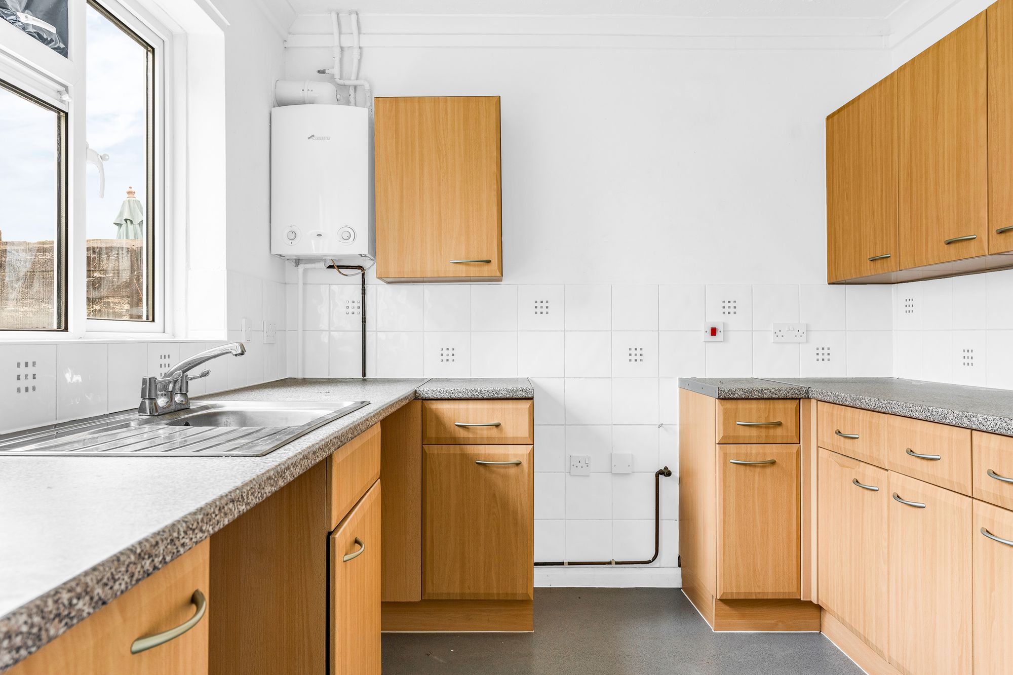 With double glazed window and door to the rear garden. Fitted with a range of wall and base storage units with work surfaces over incorporating a sink and drainer unit, appliance space, wall mounted boiler, tiled splash back areas, radiator, door to: