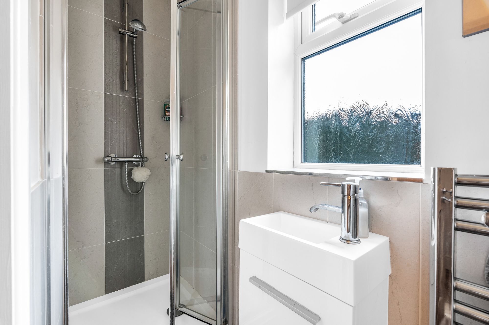 With double glazed window to side aspect with obscure glass. Fitted with a suite comprising shower cubicle, vanity unit with inset wash hand basin, dual flush wc, tiled splash back areas, tiled flooring, chrome heated towel rail.