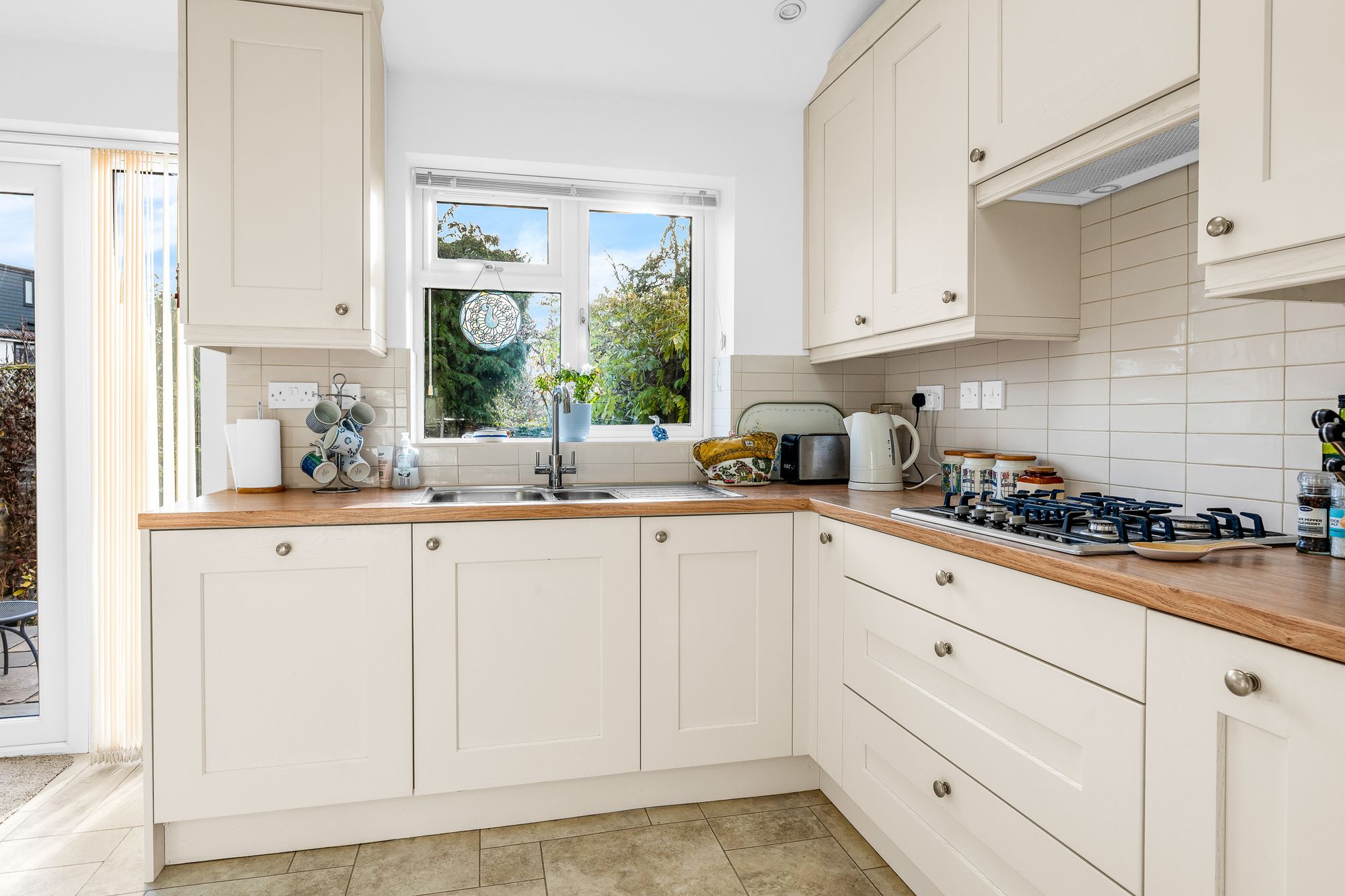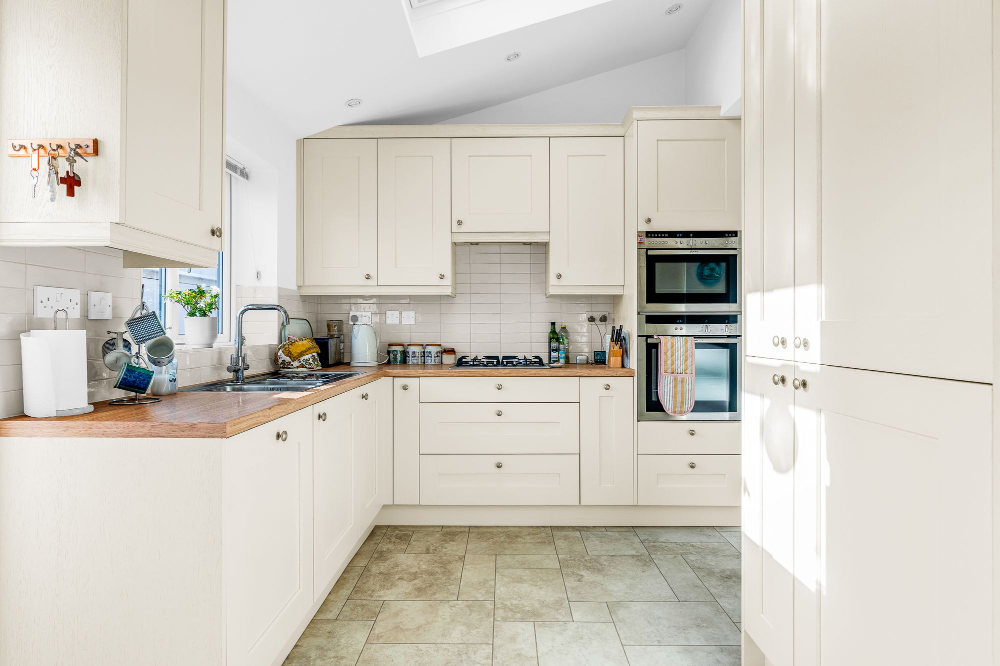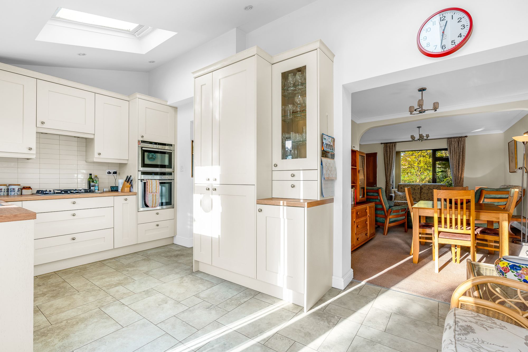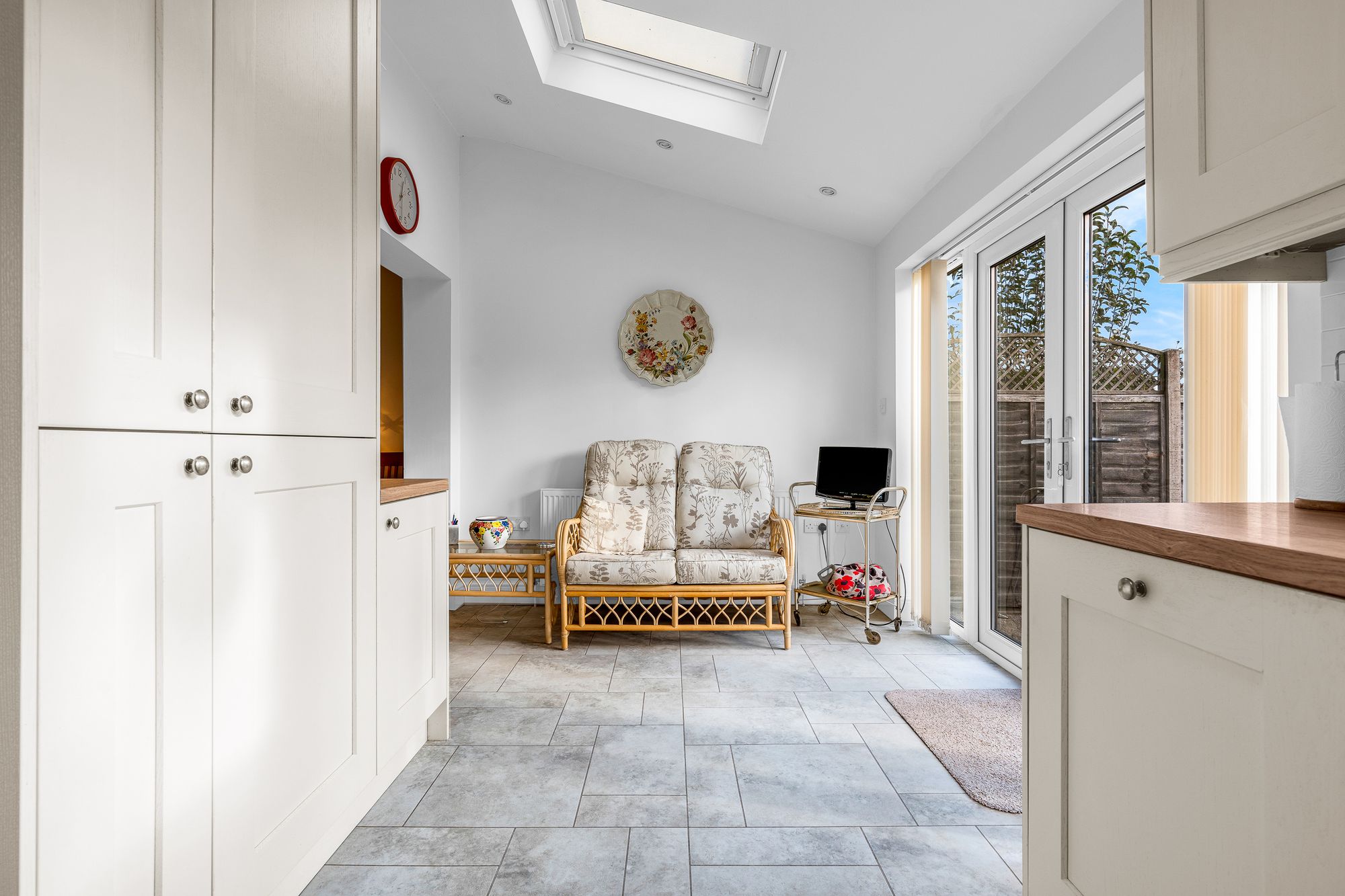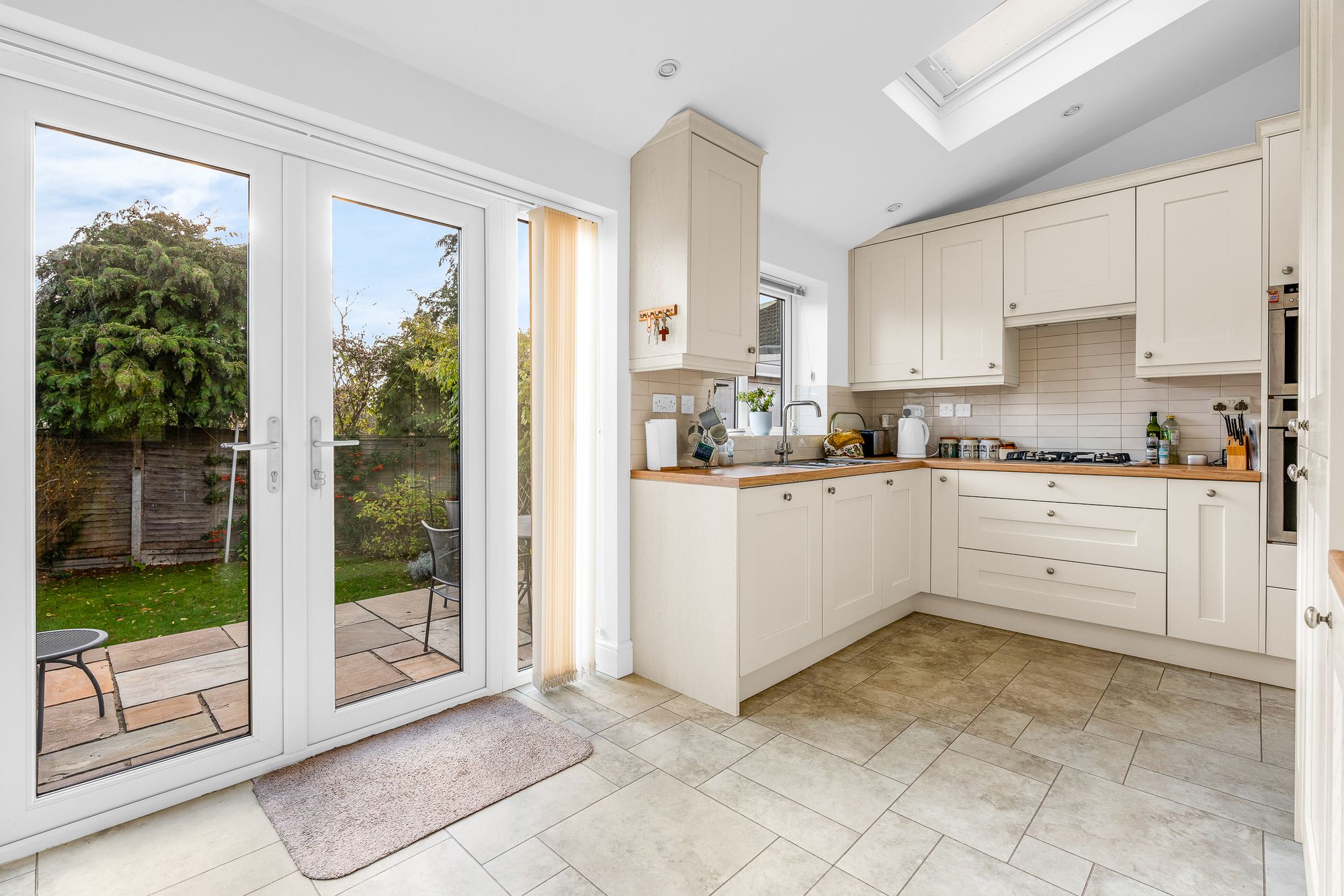 With double glazed double doors and window to the rear garden and two skylight windows. Fitted with a range of wall and base storage units with wood effect laminate work surfaces over incorporating a sink and drainer unit, integrated appliances, Kardean flooring, radiator, door to the entrance hall.