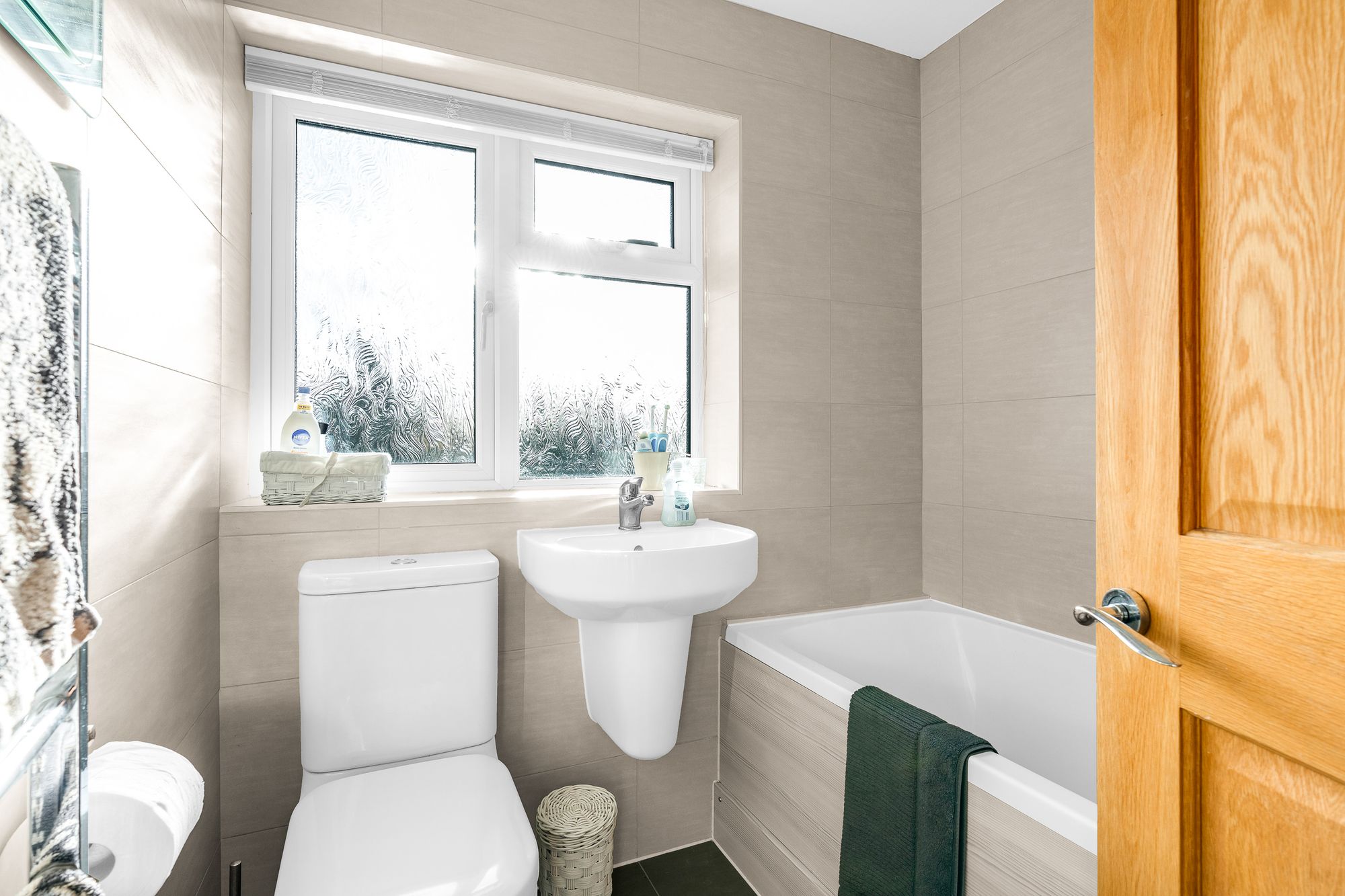 With double glazed window to rear aspect with obscure glass. Fitted with a suite comprising panel enclosed bath, wall hung wash hand basin, dual flush wc, fully tiled, chrome heated towel rail.