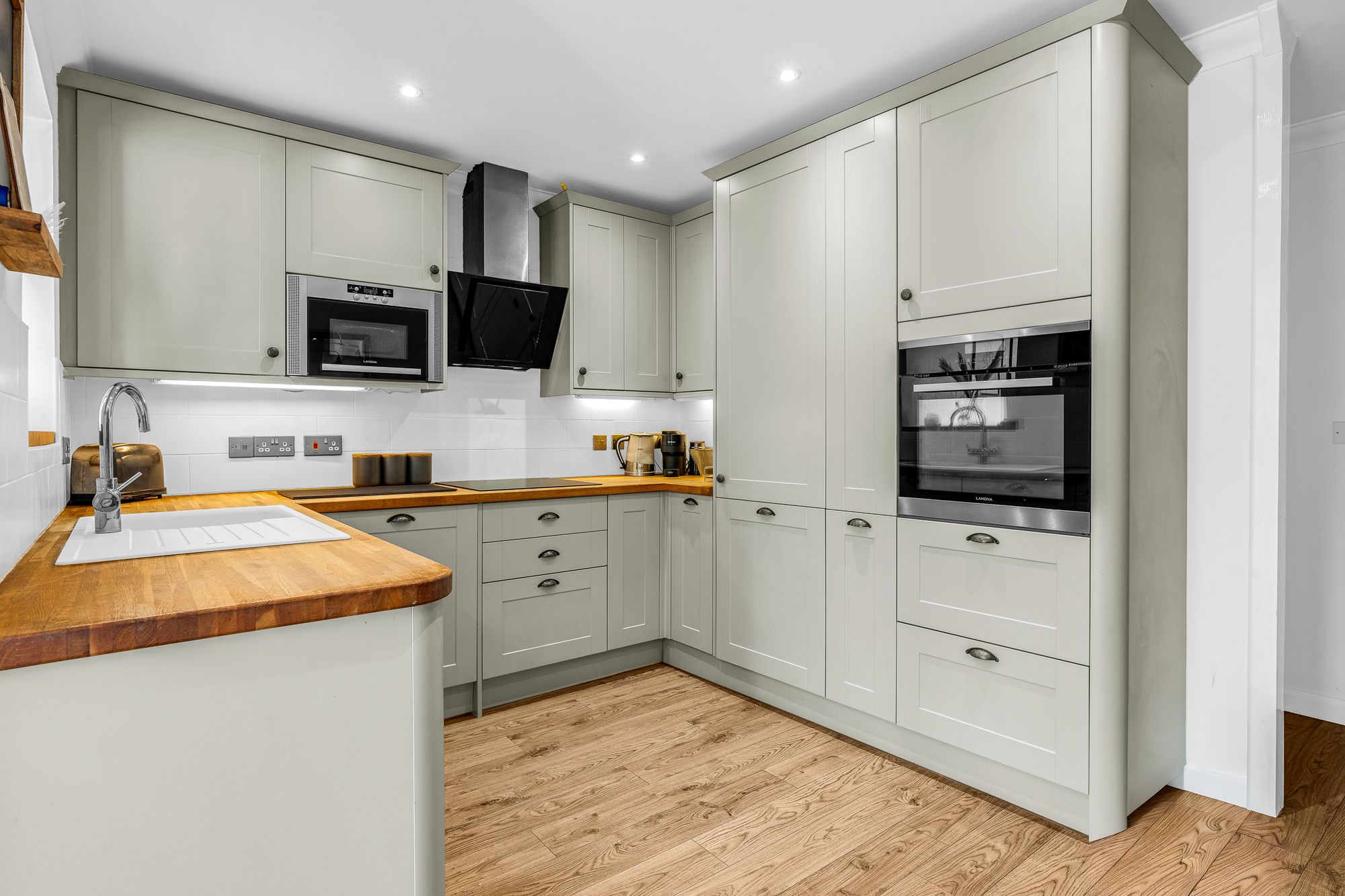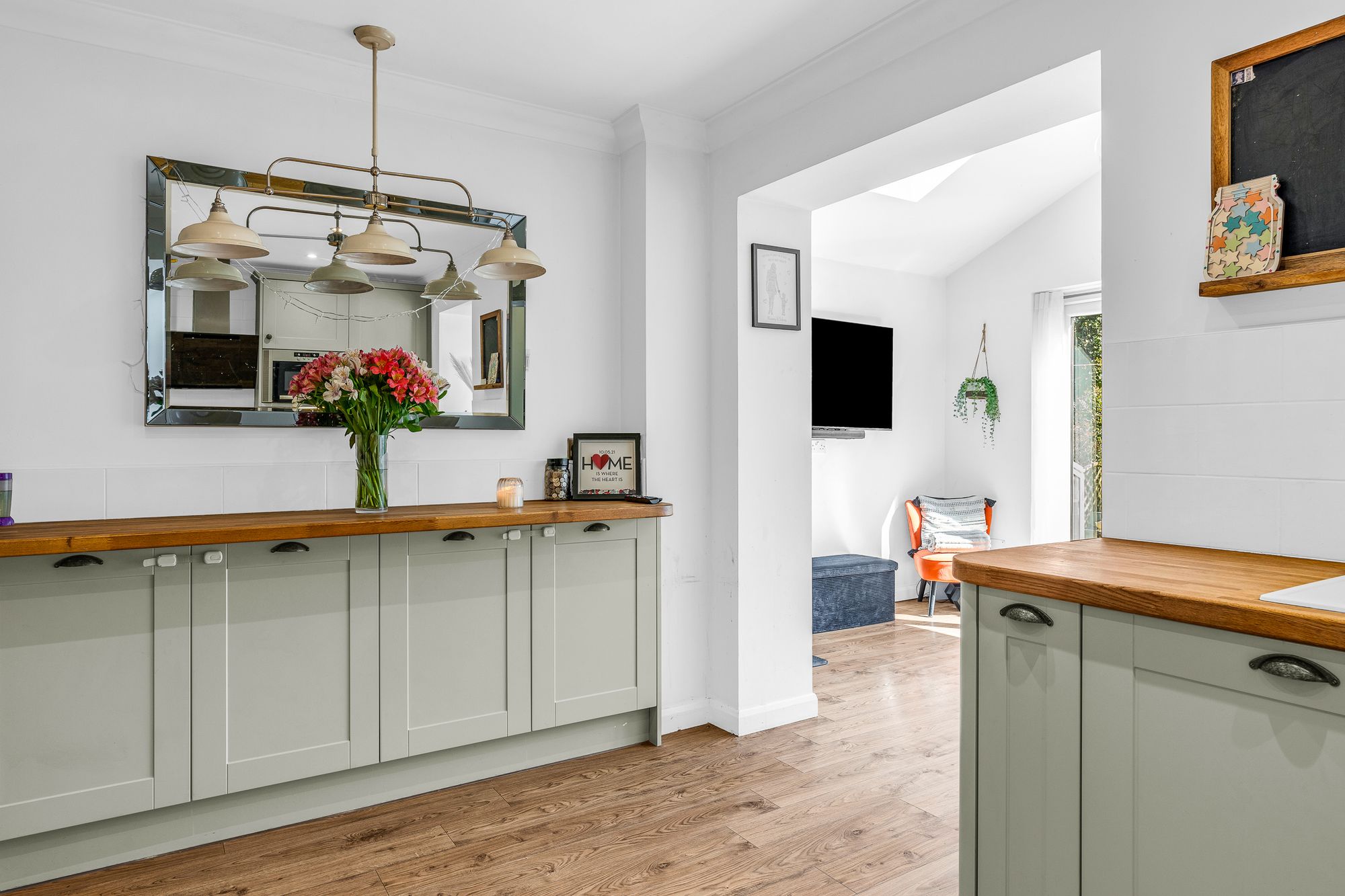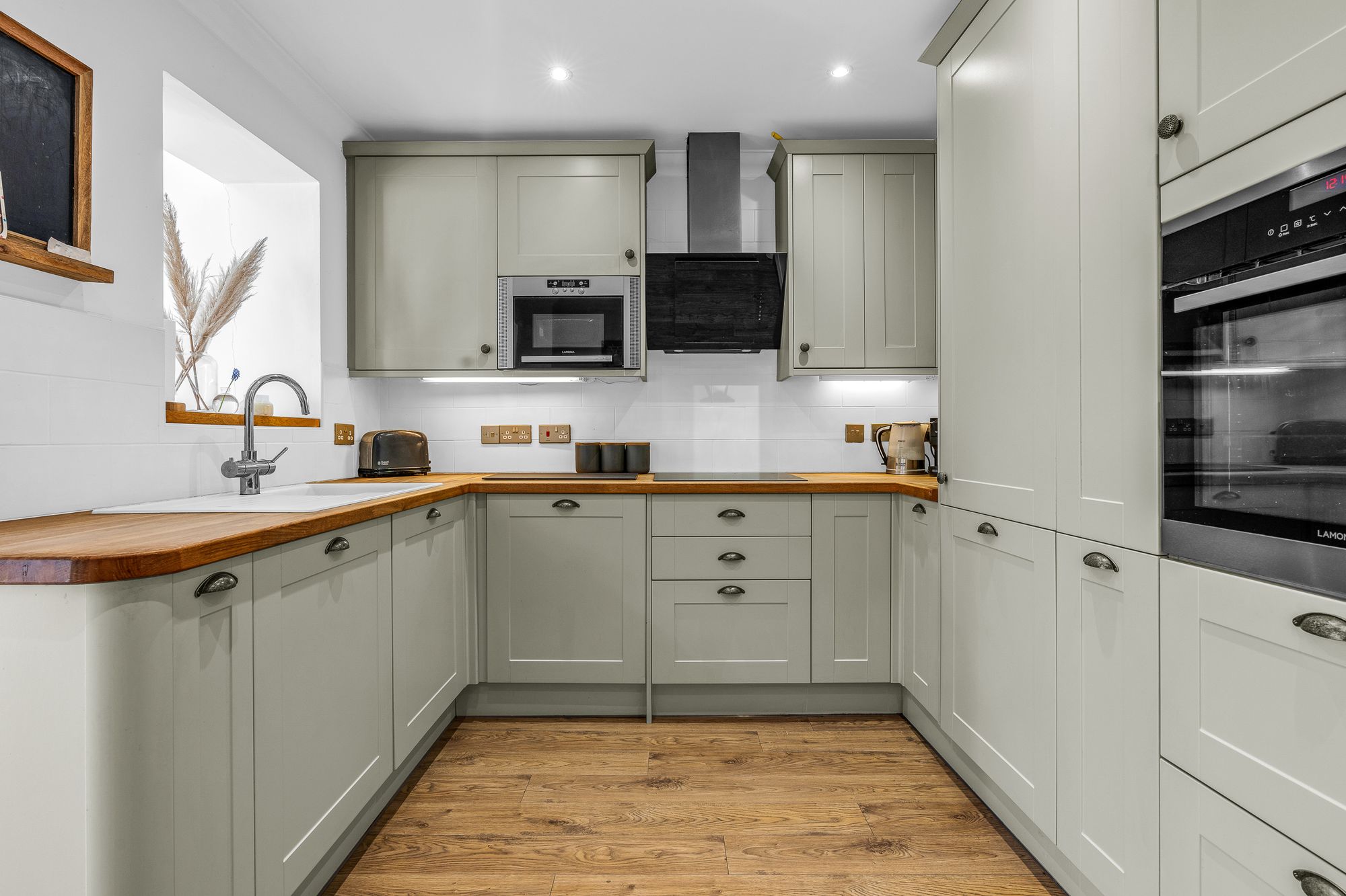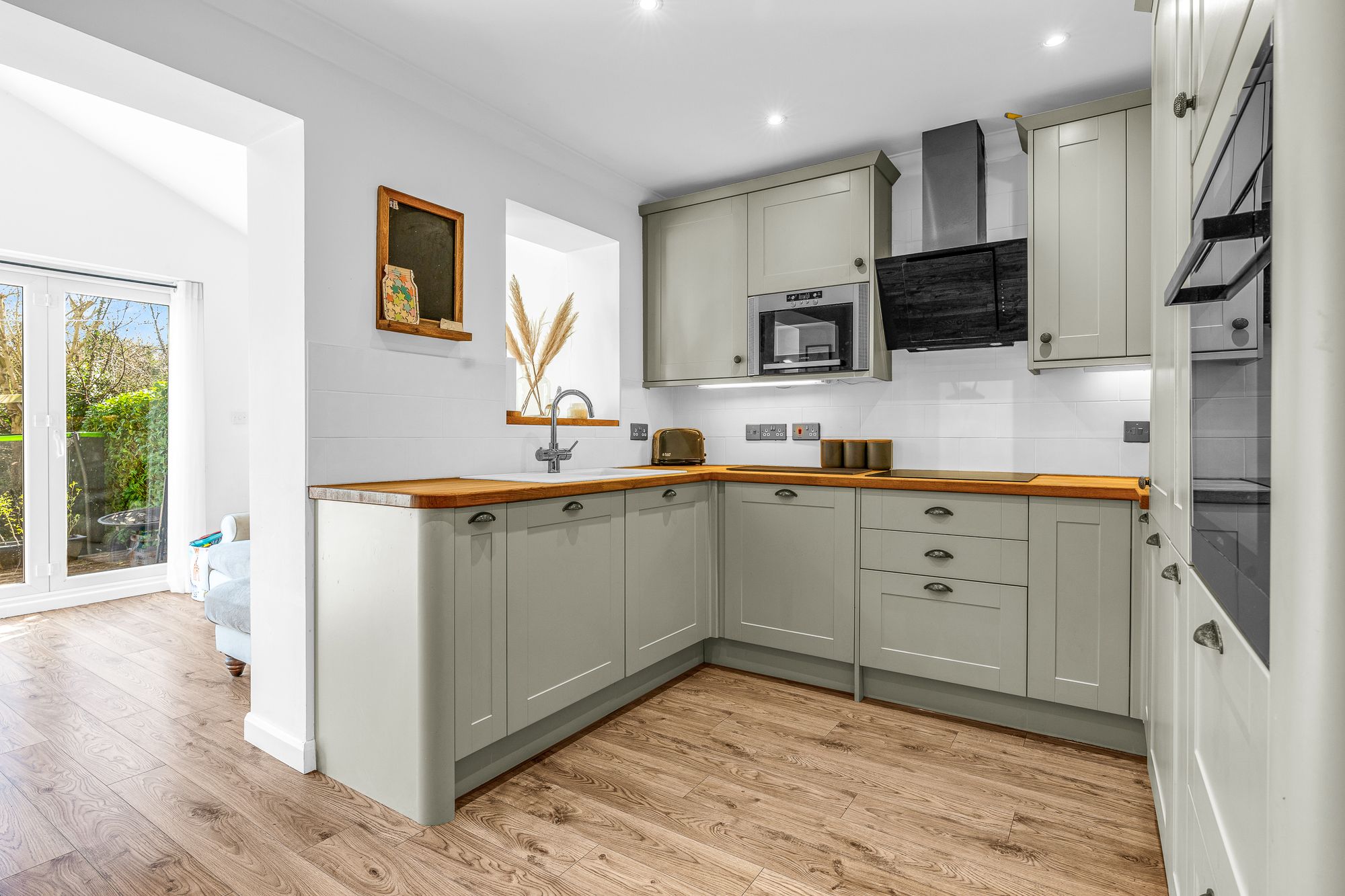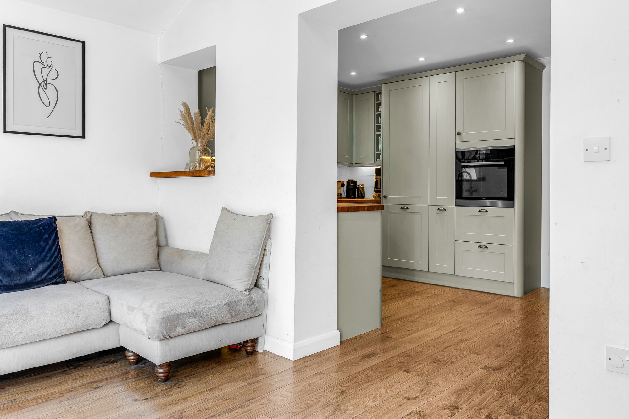 Fitted with a range of wall and base storage units with wood work surfaces over incorporating a sink and drainer unit, fully integrated, tiled splash back areas, wood flooring, open to the living room, door to: