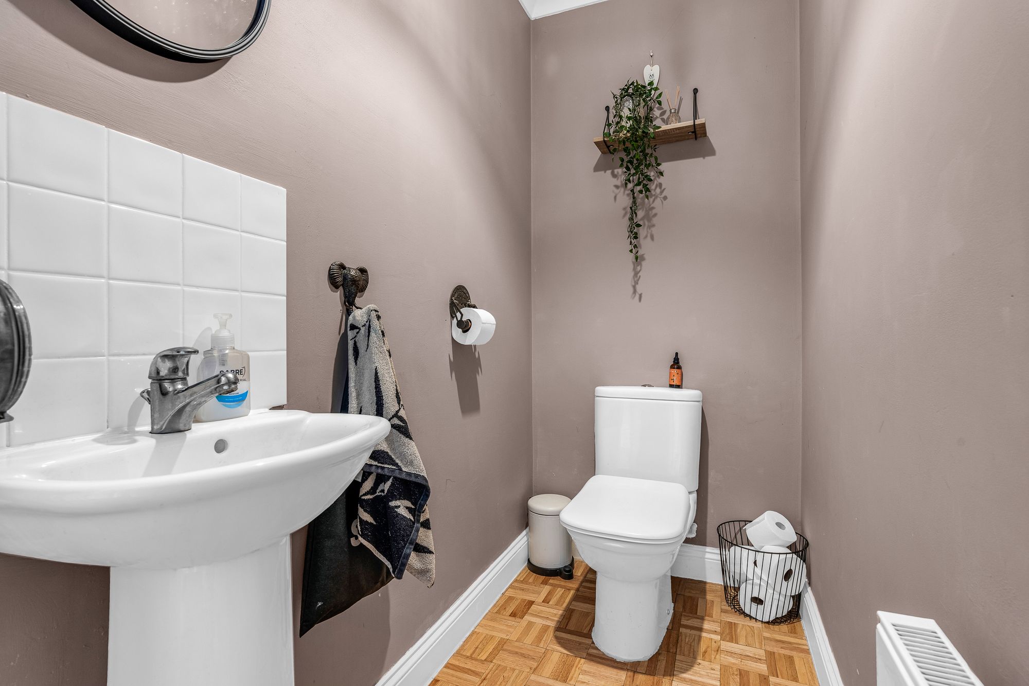 Fitted with a suite comprising dual flush wc, pedestal wash hand basin, tiled splash back areas, wood flooring, radiator.