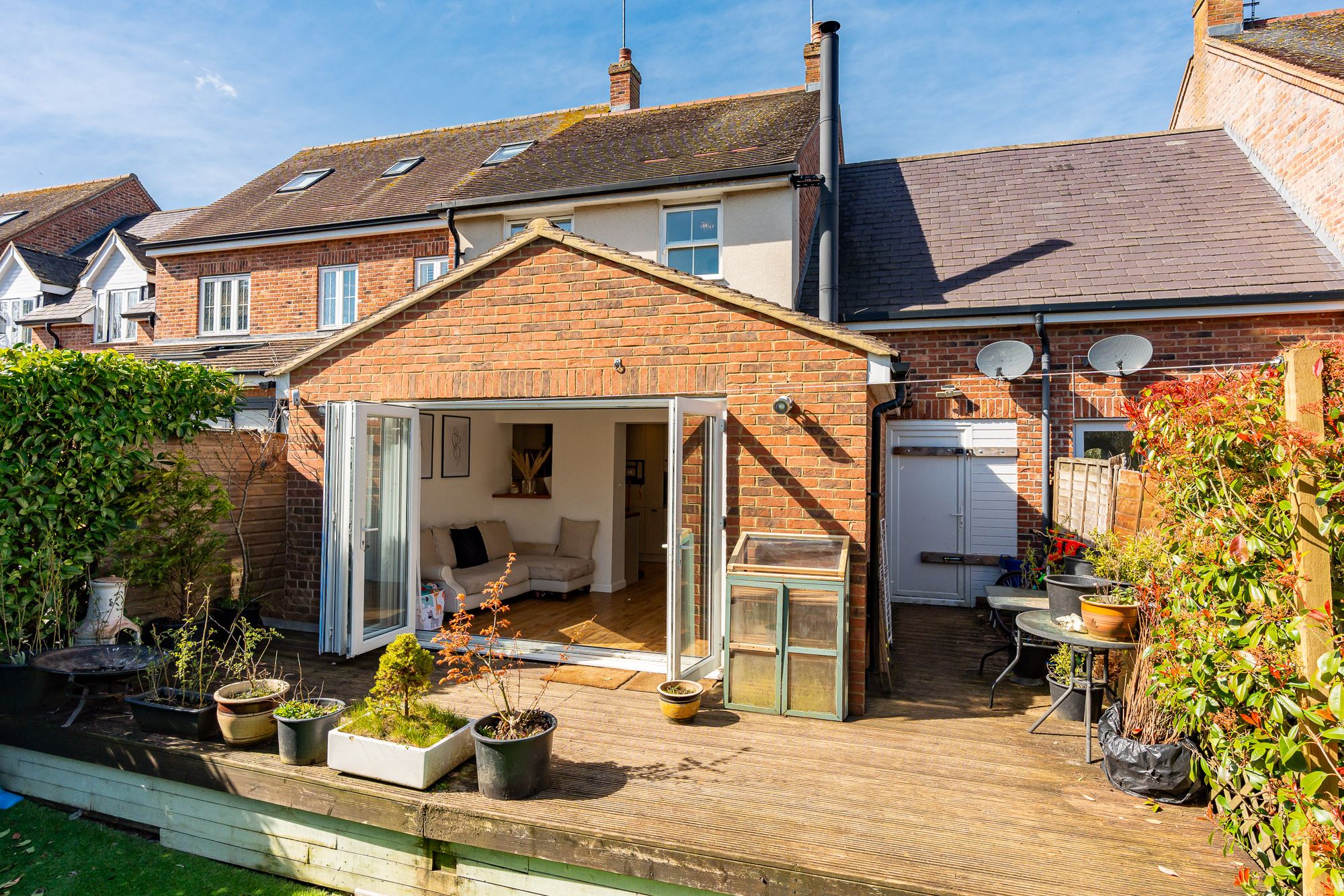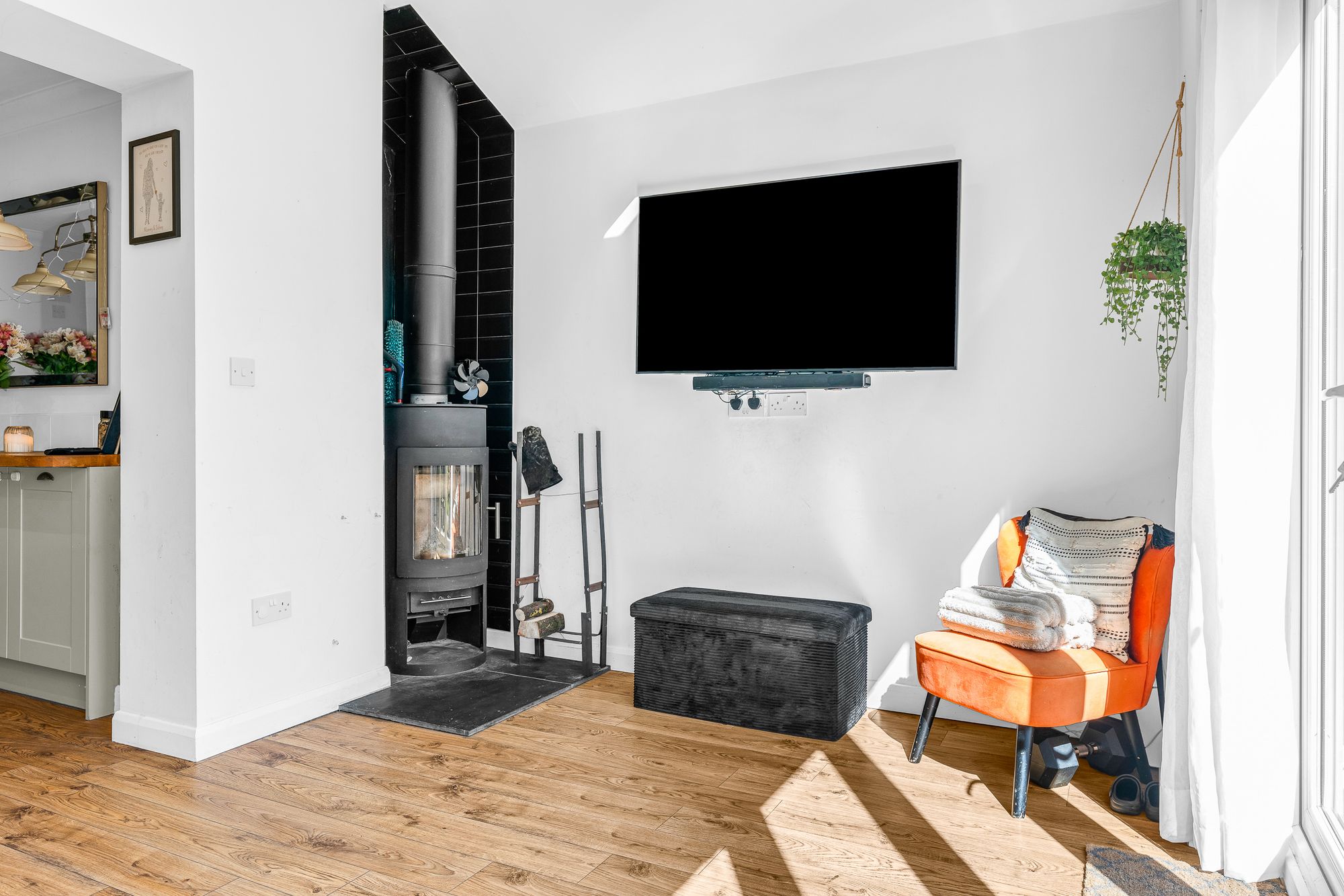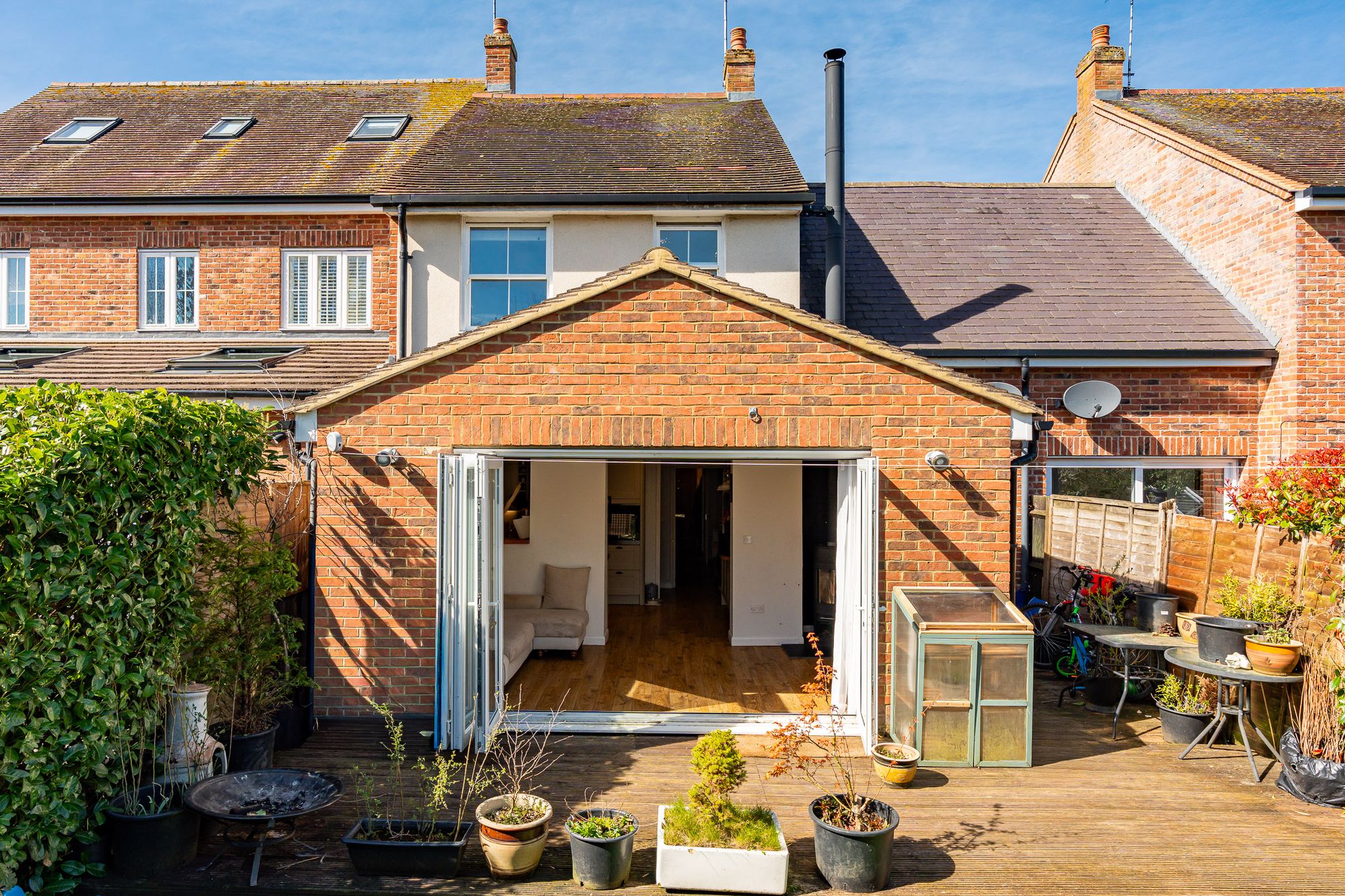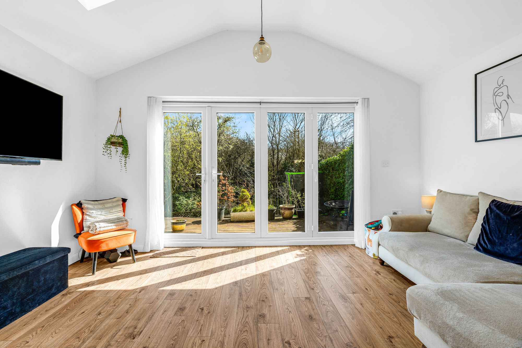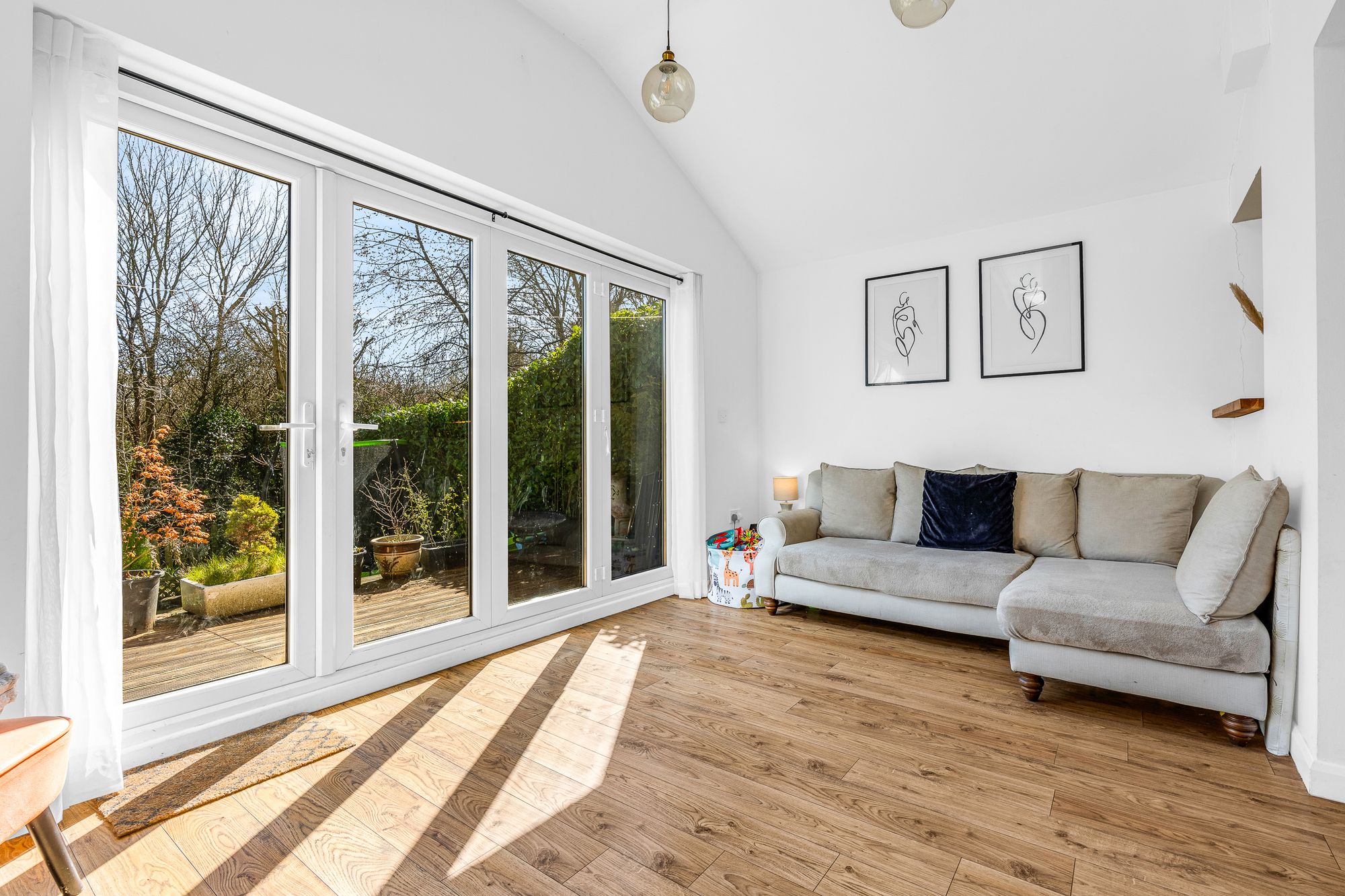 Vaulted ceiling with Velux windows and bi fold doors opening onto the low maintenance garden, multi fuel 'Westfire' stove, wood flooring.