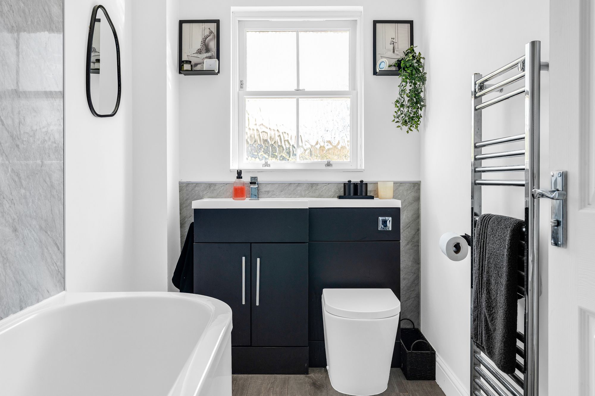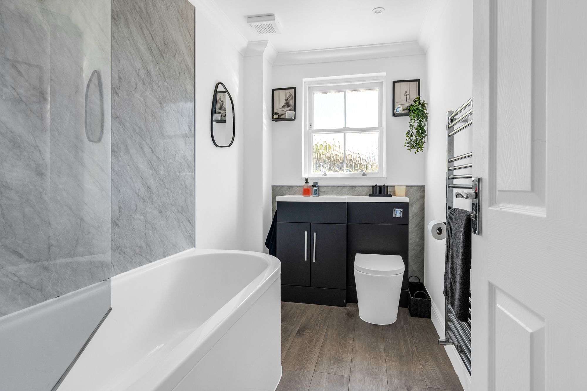 With double glazed sash style window to rear aspect with obscure glass. Fitted with a suite comprising panel enclosed bath with shower over and glass shower screen, vanity unit with inset wash hand basin, concealed cistern wc, tiled splash back areas, wood effect flooring, chrome heated towel rail.