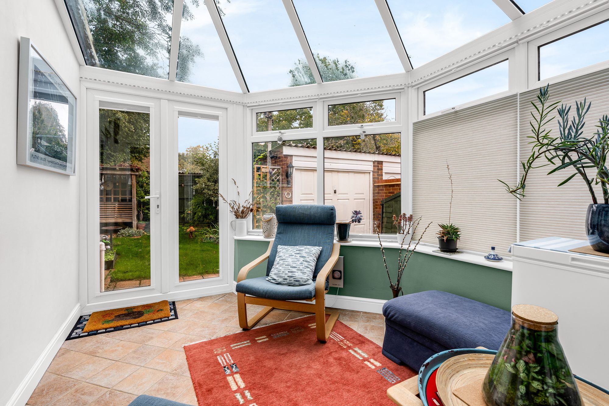 Of double glazed and brick construction with double doors opening onto the rear garden, tiled flooring, electric wall heater.