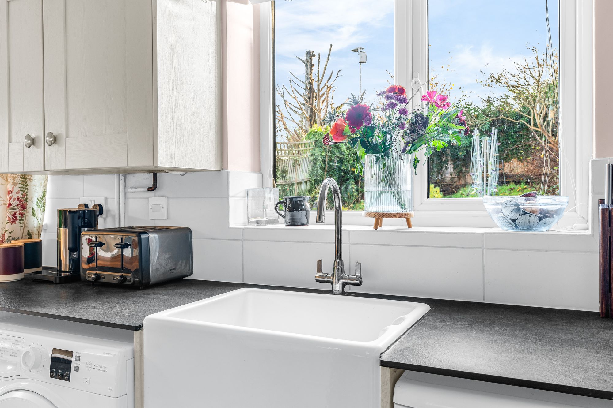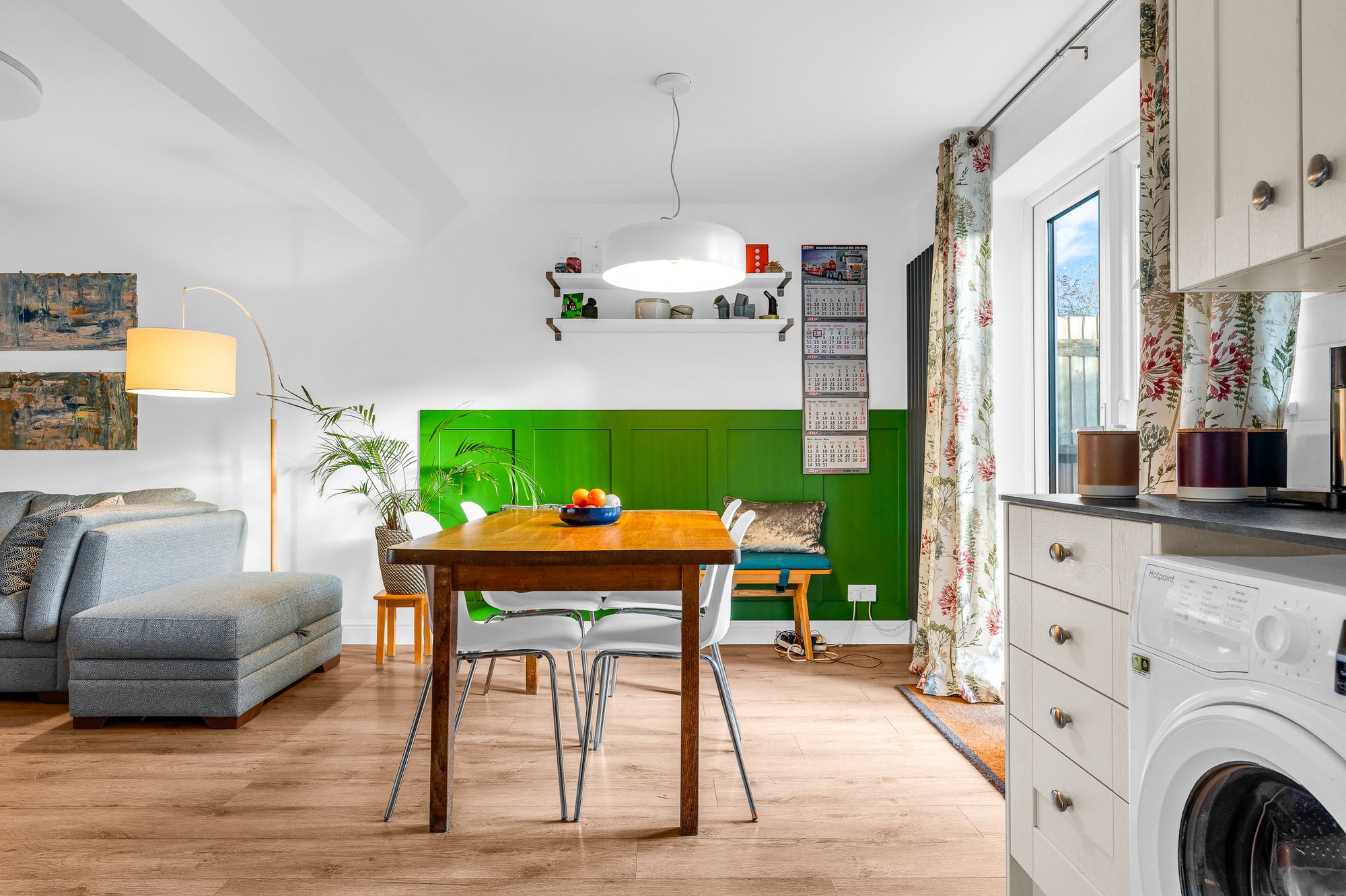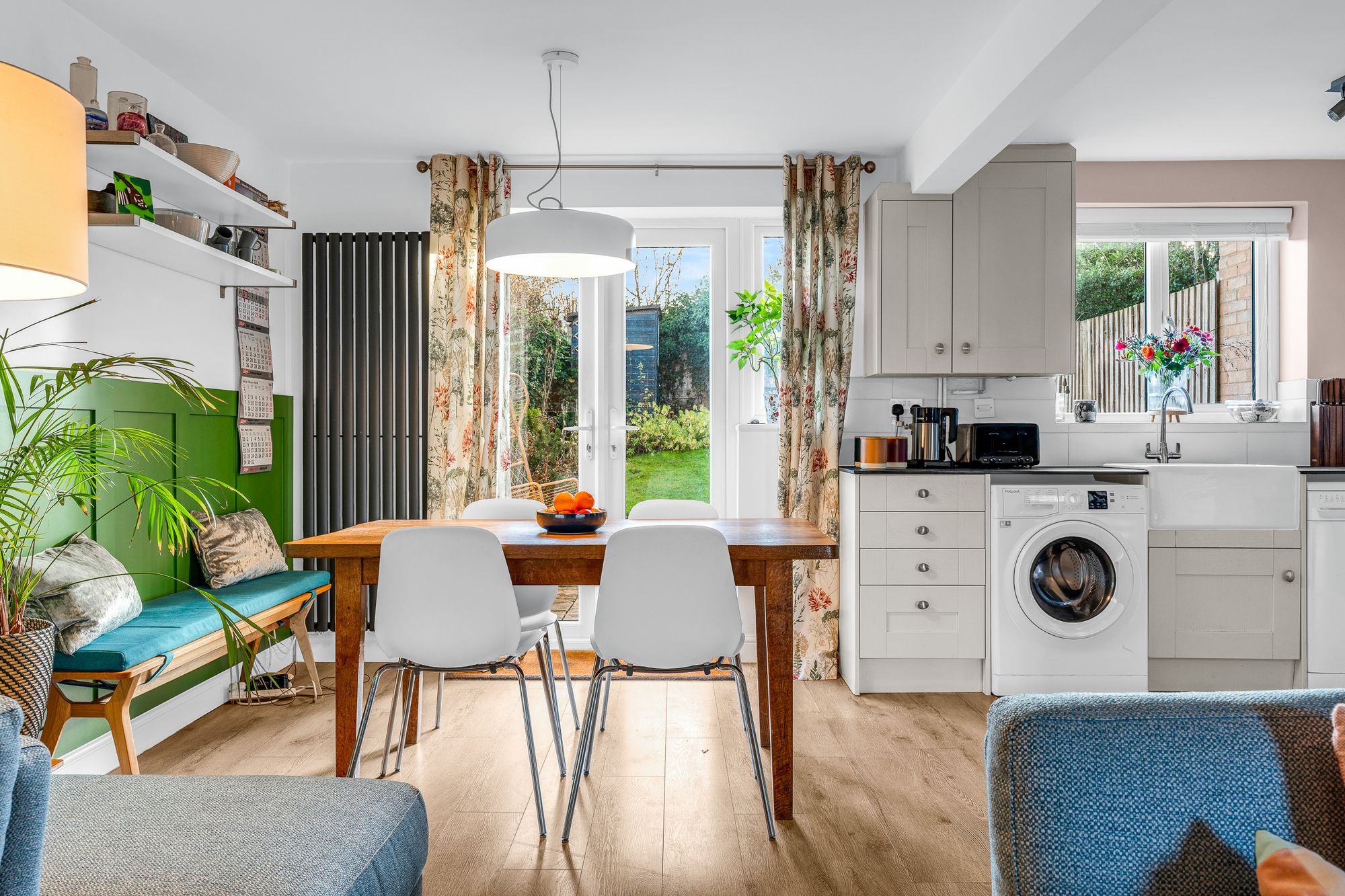 With double glazed double doors and window opening onto the rear garden. Fitted with a range of wall and base storage units with worksurfaces over incorporating a Butler style sink unit, built in oven with hob and extractor over, appliance space, tiled splash back areas, wood flooring, vertical radiator.
