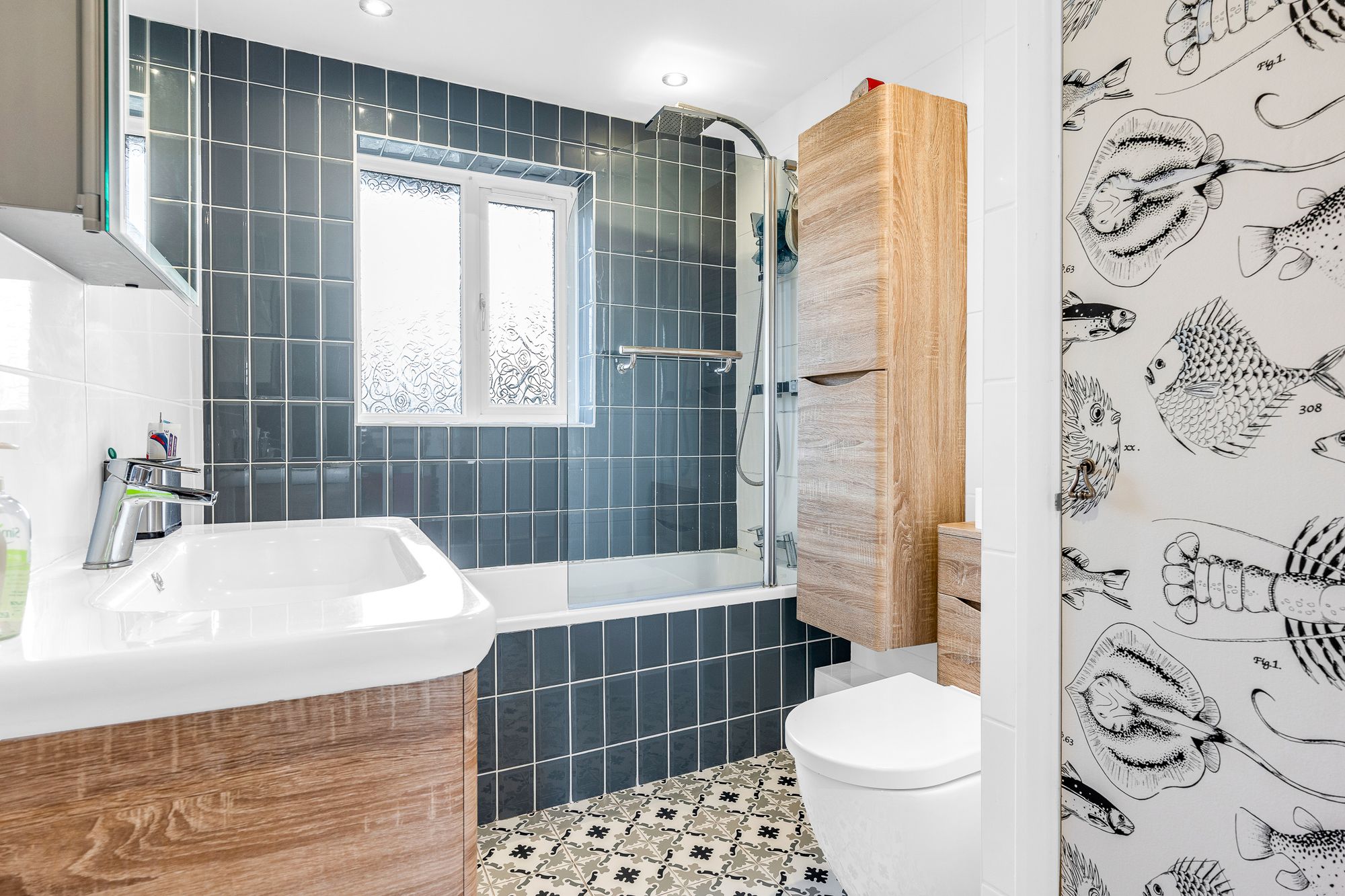 With double glazed window to rear aspect with obscure glass. Fitted with a suite comprising tile enclosed bath with shower over and glass shower screen, concealed cistern wc, vanity unit with inset wash hand basin, tiled splash back areas, tiled flooring, radiator, built in storage cupboard.