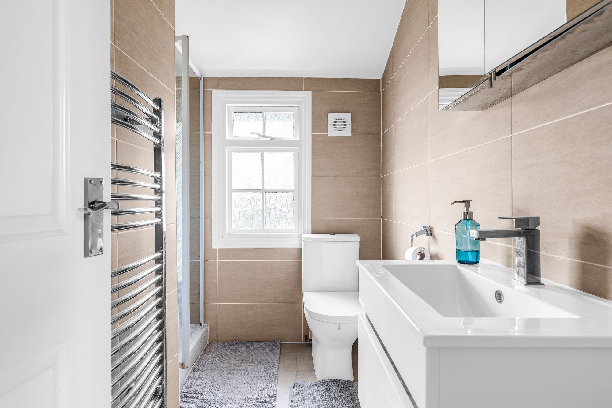Fitted with a suite comprising a fully tiled walk shower with glass screen, low level w.c, wall mounted wash hand basin. tiled splash back areas, chrome heated towel rail, tiled flooring.