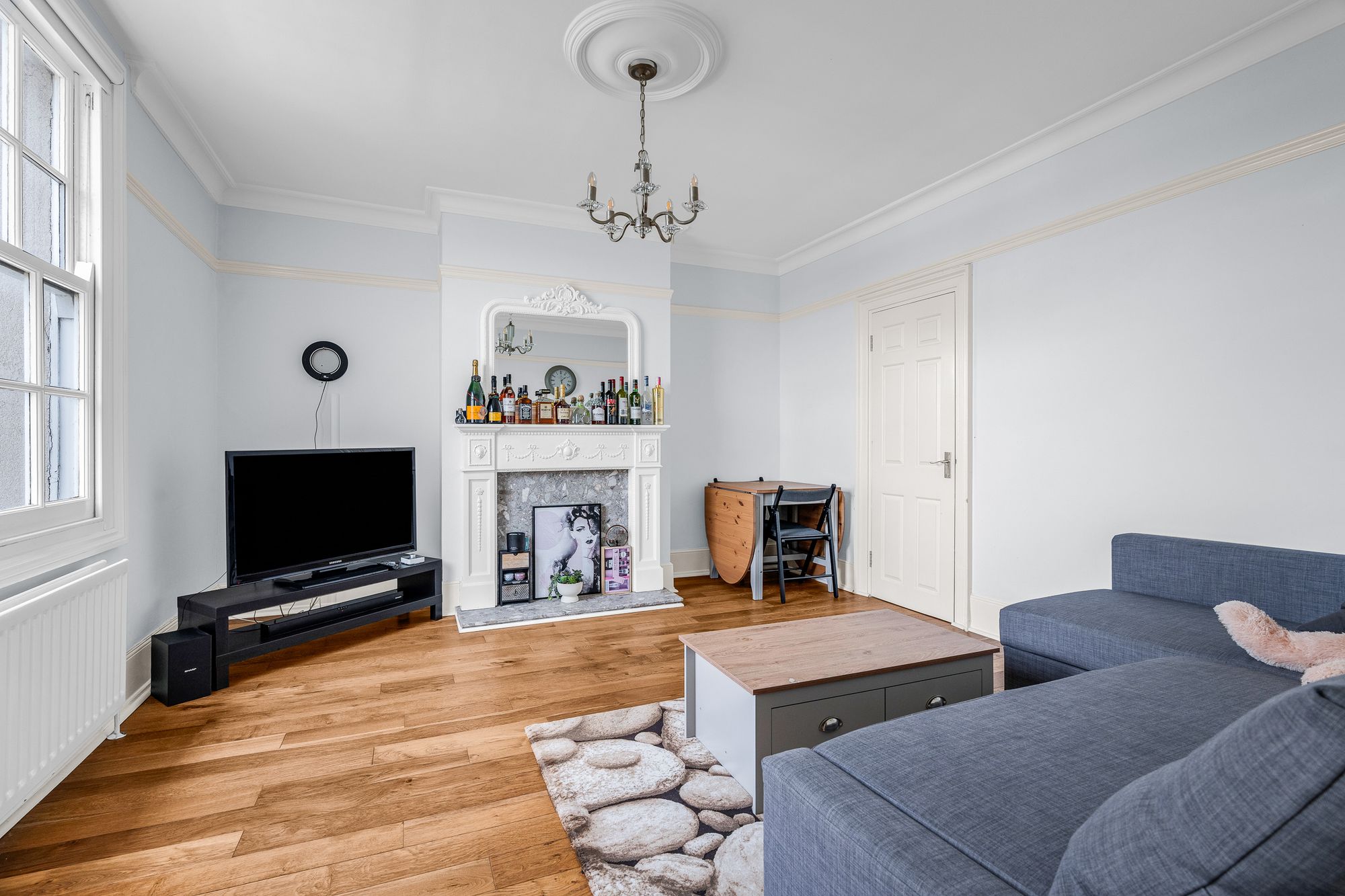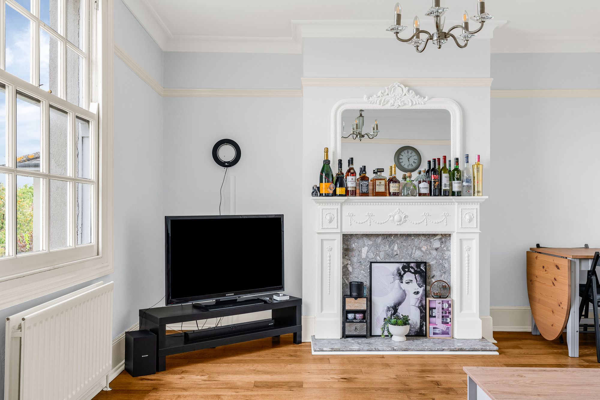 With sash window to rear aspect, feature fireplace with ornate surround, solid wood flooring, radiator, storage cupboard.
