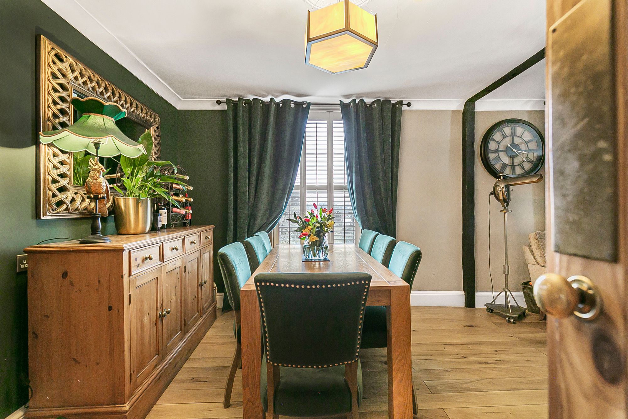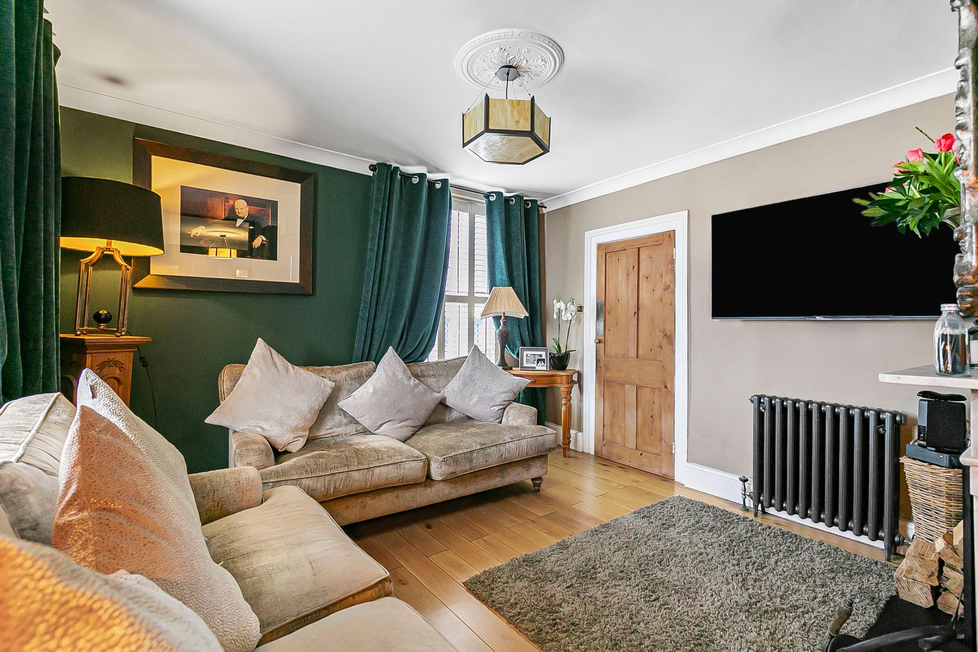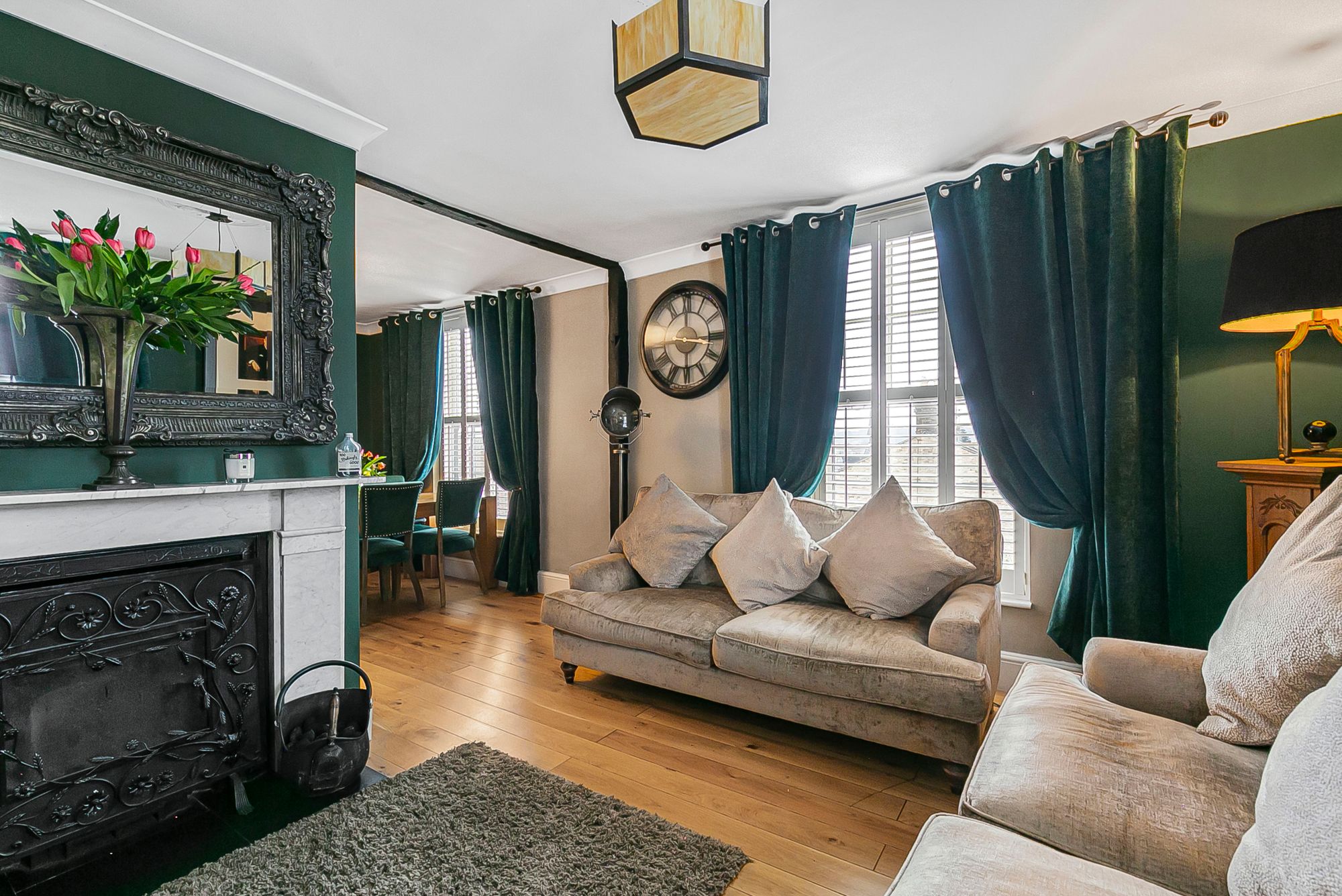 Dual aspect with windows to front and side aspect with fitted shutters, wood flooring, attractive working central fireplace, two radiators, door to: