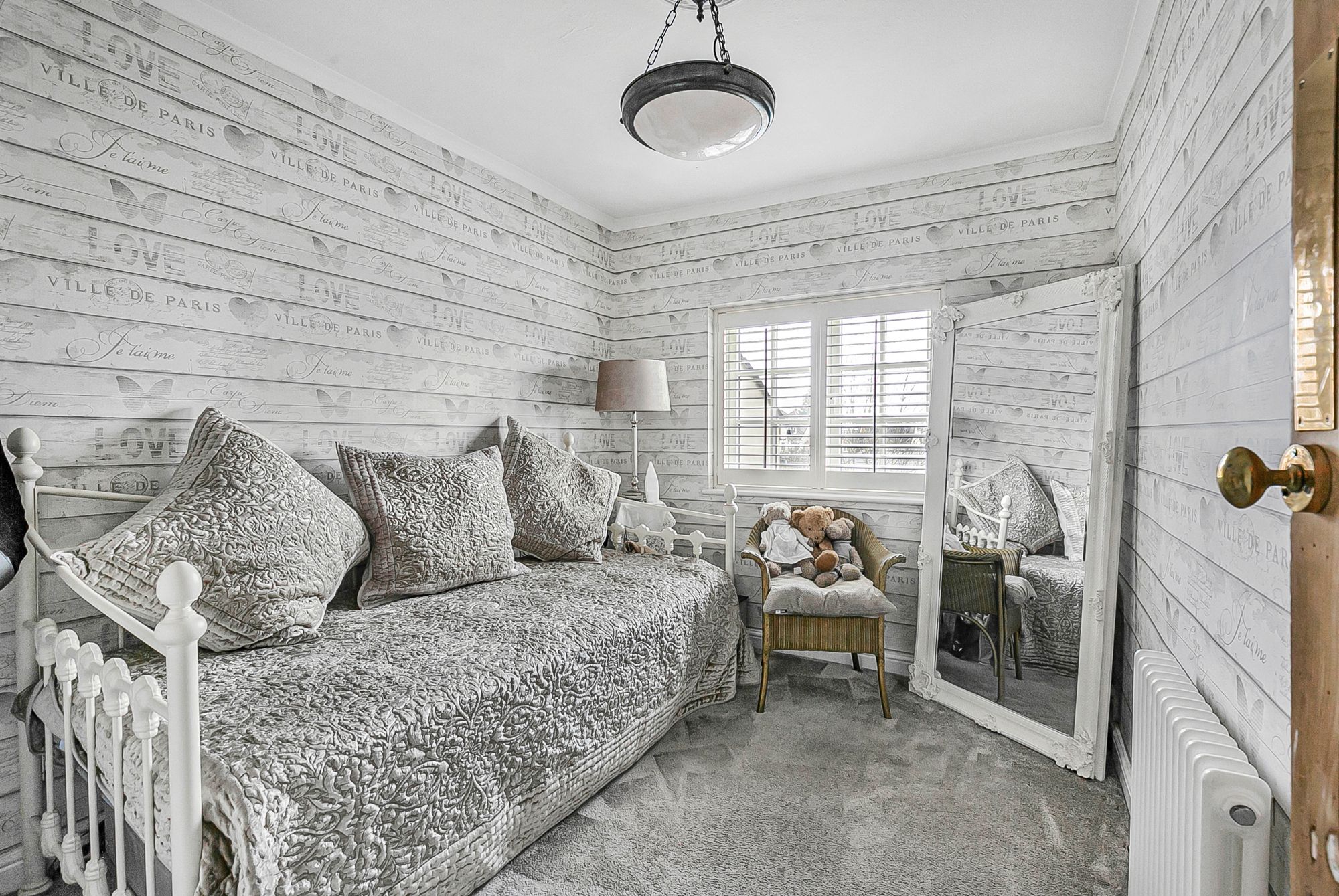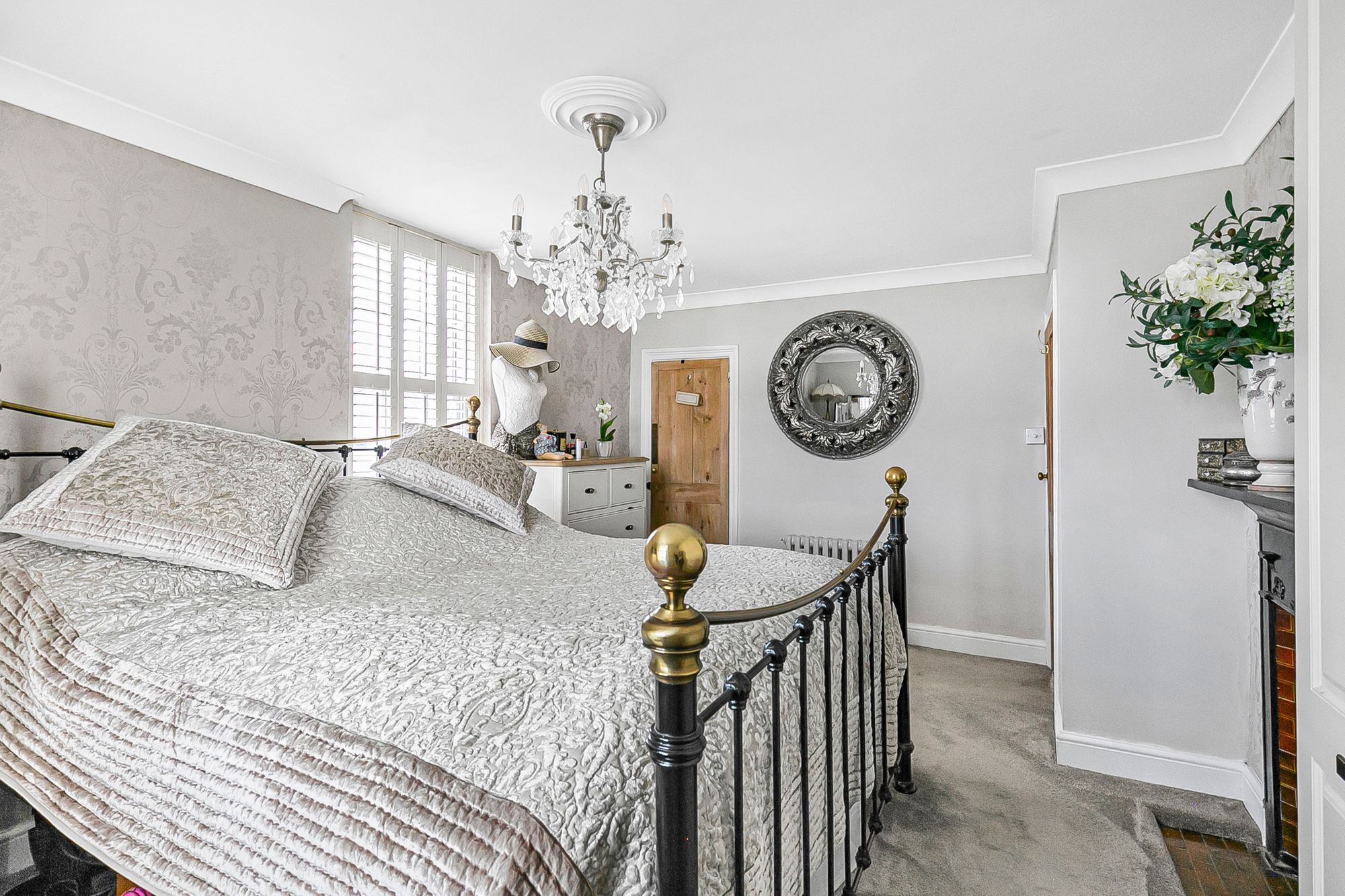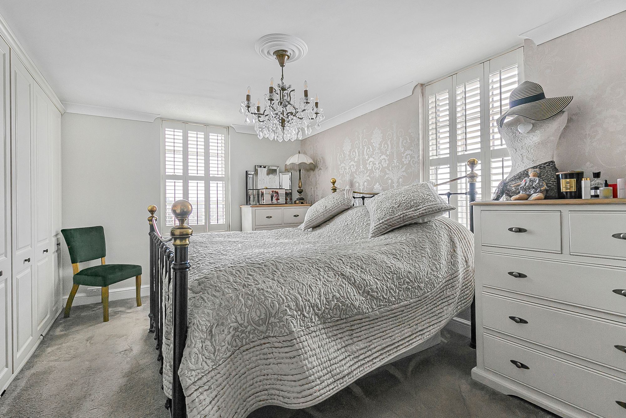 Dual aspect with windows to front and side aspect with fitted shutters, radiator, fitted wardrobe cupboards, door to: