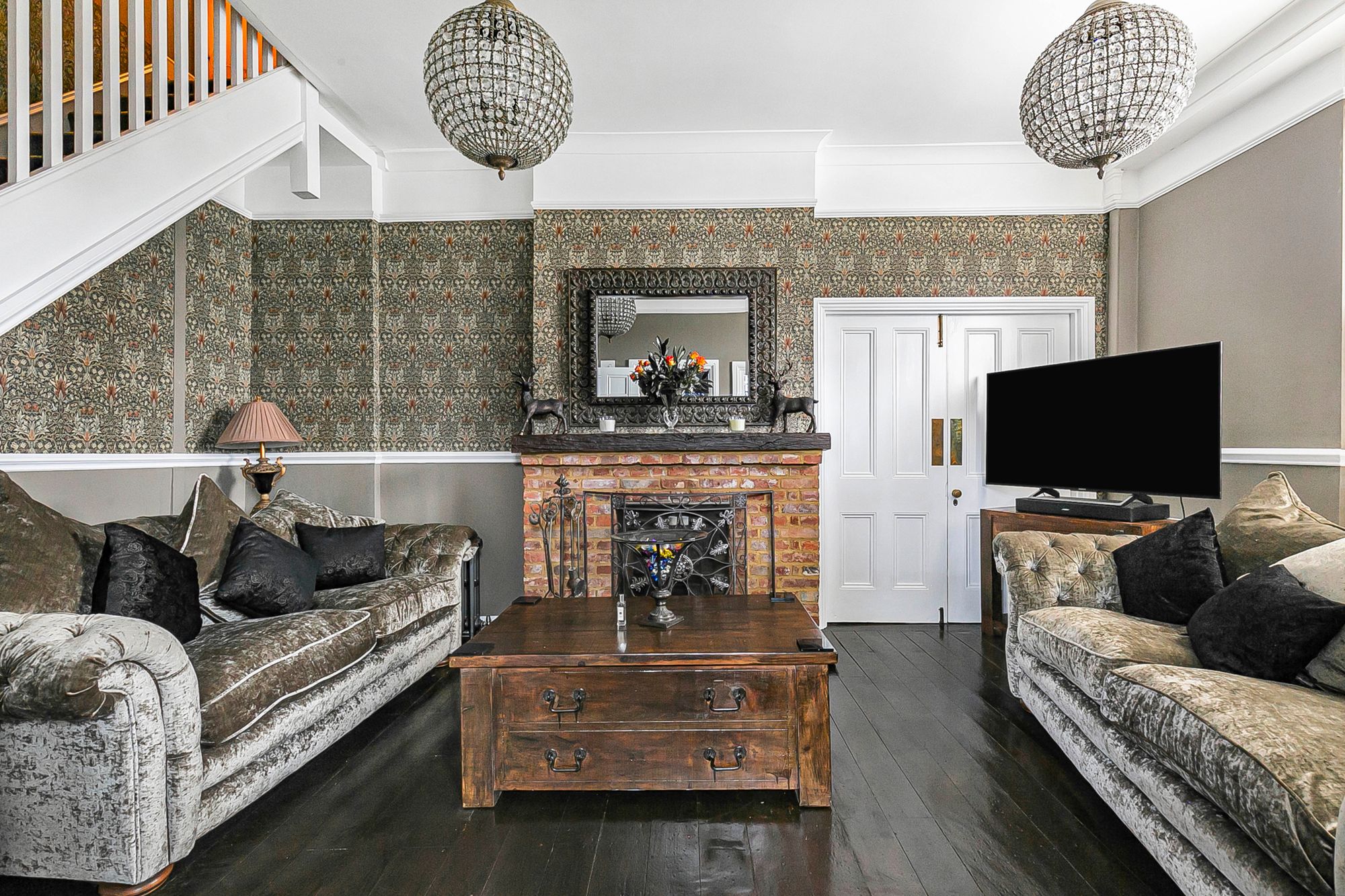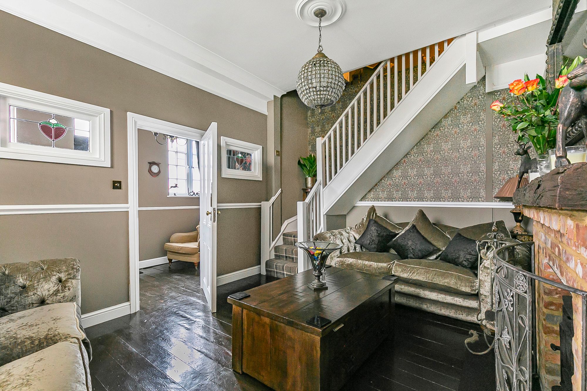 With window to side aspect, stairs rising to first floor landing, wood flooring, attractive fireplace, double doors to: