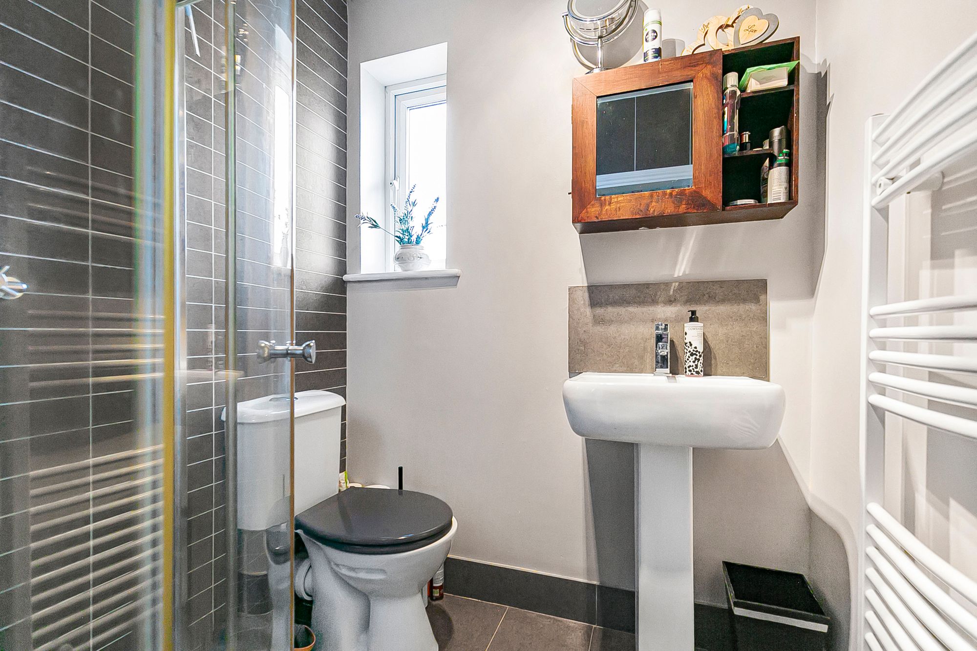 Fitted with a suite comprising shower cubicle, wash hand basin, wc and radiator.
