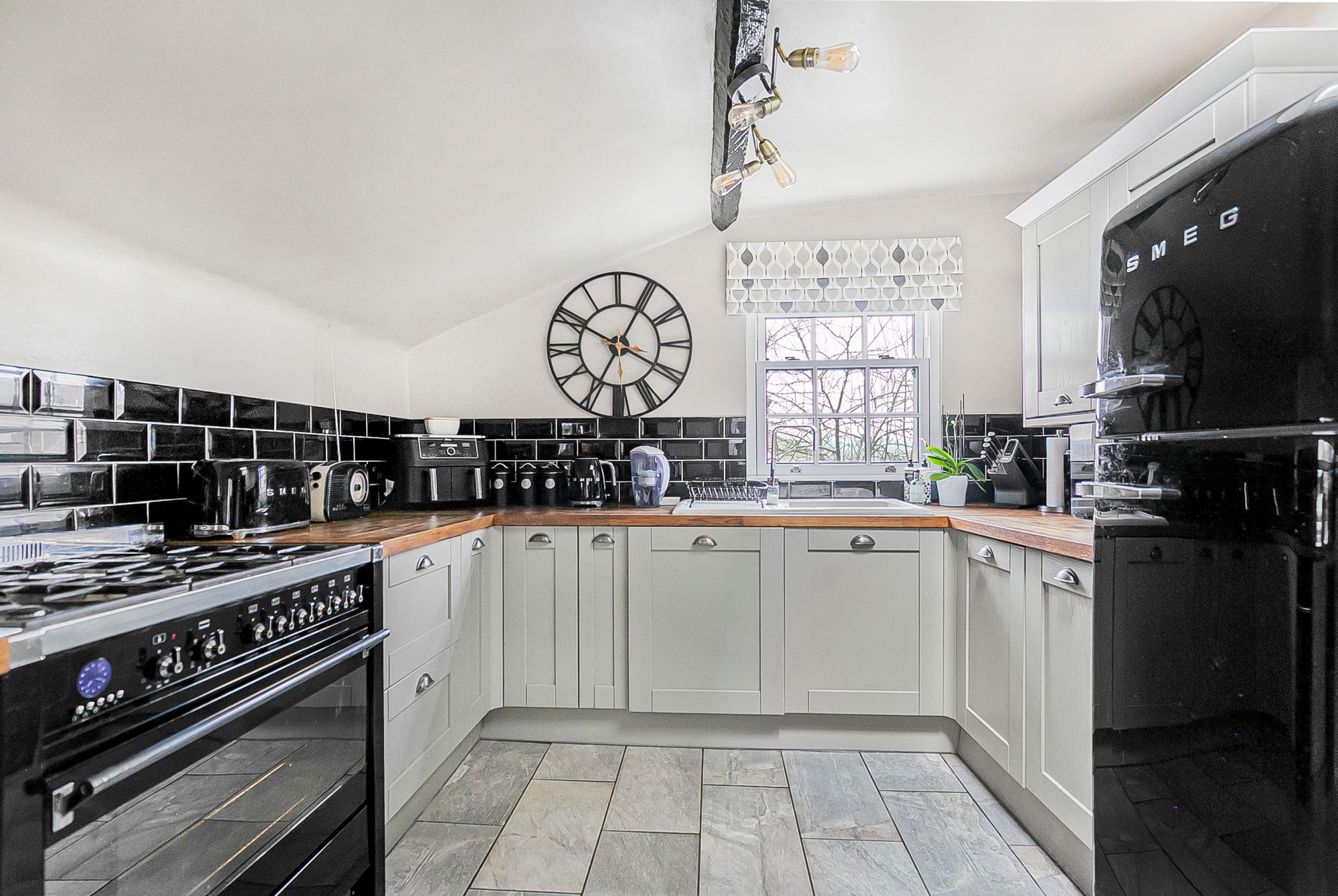 Dual aspect with windows to rear and side aspect together with a door giving access to the terrace. Fitted with a range of wall and base storage units with wood work surfaces over incorporating a sink and drainer unit, space for range style cooker, washing machine and fridge/freezer, integrated dishwasher, tiled splash back areas, tiled flooring, radiator.