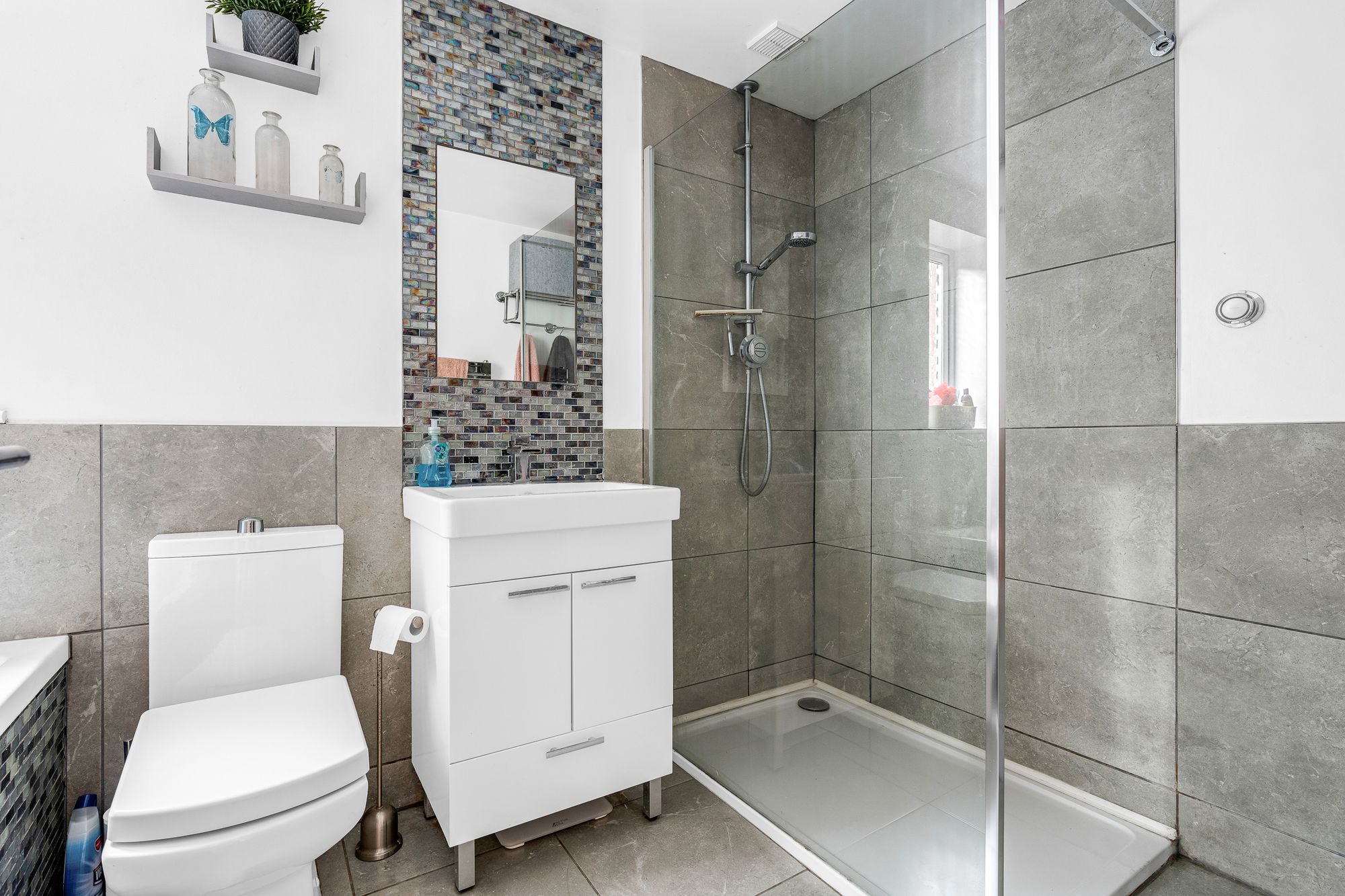 With Upvc double glazed window to side aspect with obscure glass. Fitted with a suite comprising dual flush wc, vanity unit with inset wash hand basin, tiled mosaic decorative mirror, radiator, tiled flooring.