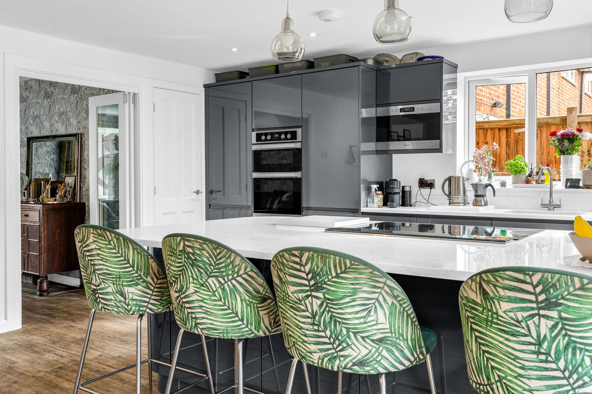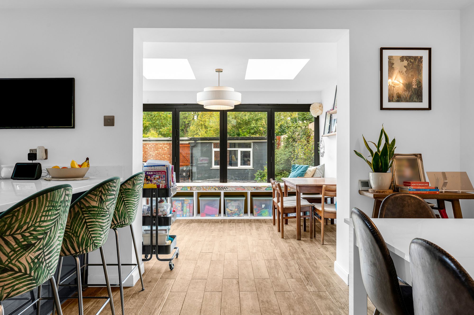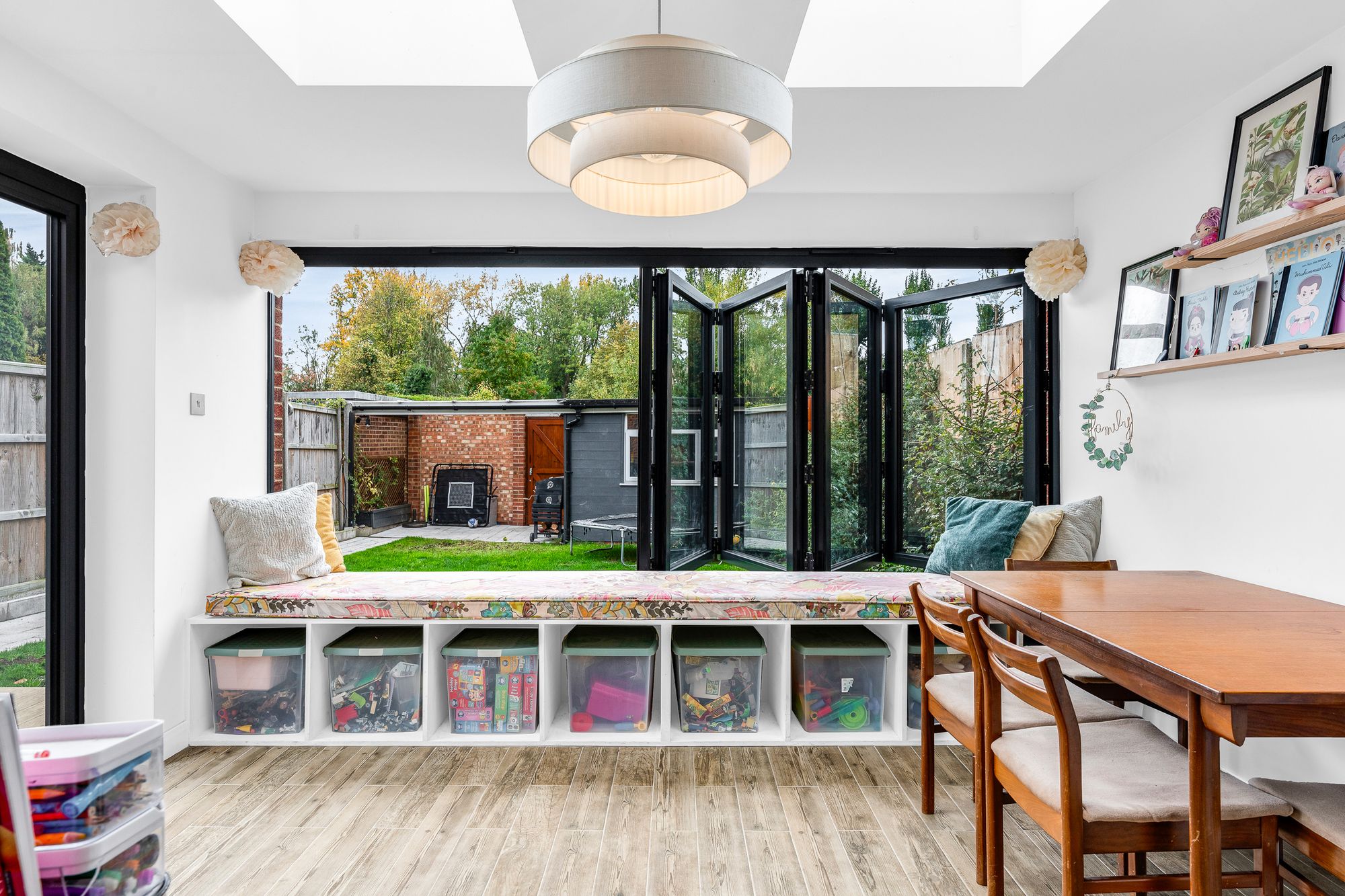 With Upvc double glazed door to side aspect and Upvc double-glazed bi-folding window to rear spanning complete wall with bespoke window seating and storage area, two sky light windows, wood effect flooring with underfloor heating.
