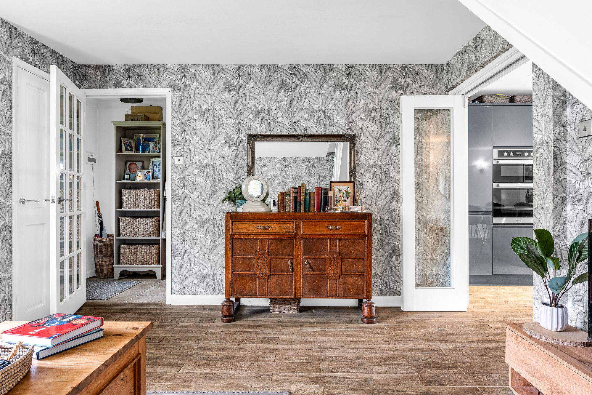 With Upvc double glazed box bay window to front aspect, built in cloaks cupboard, cupboard housing boiler, stairs to first floor landing, wood effect flooring with underfloor heating, radiator. Bi fold doors to :