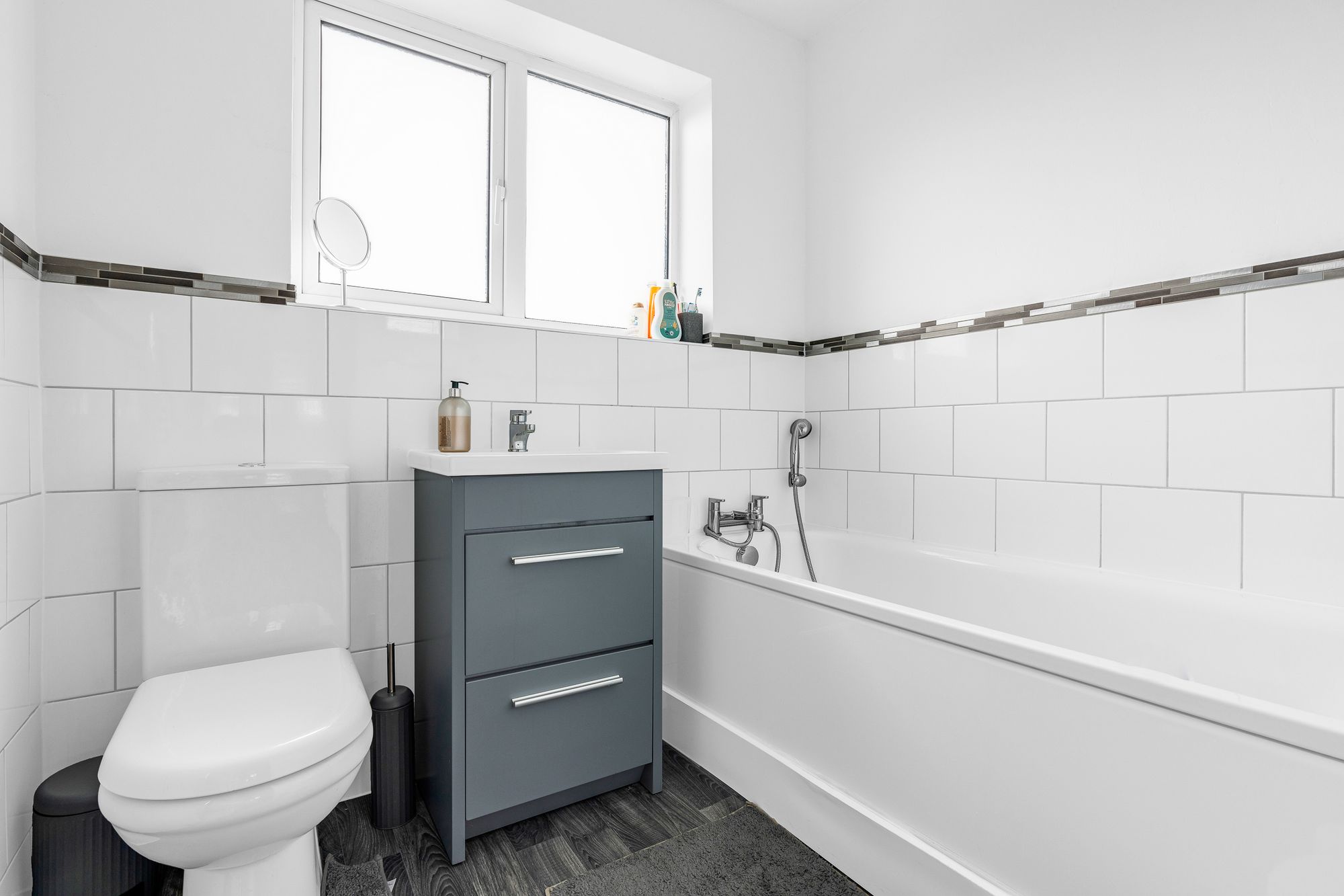 With double glazed window to rear aspect with obscure glass. Fitted with a suite comprising panel enclosed bath, vanity unit with inset wash hand basin, dual flush wc, tiled splash back areas, wood effect flooring, chrome heated towel rail.