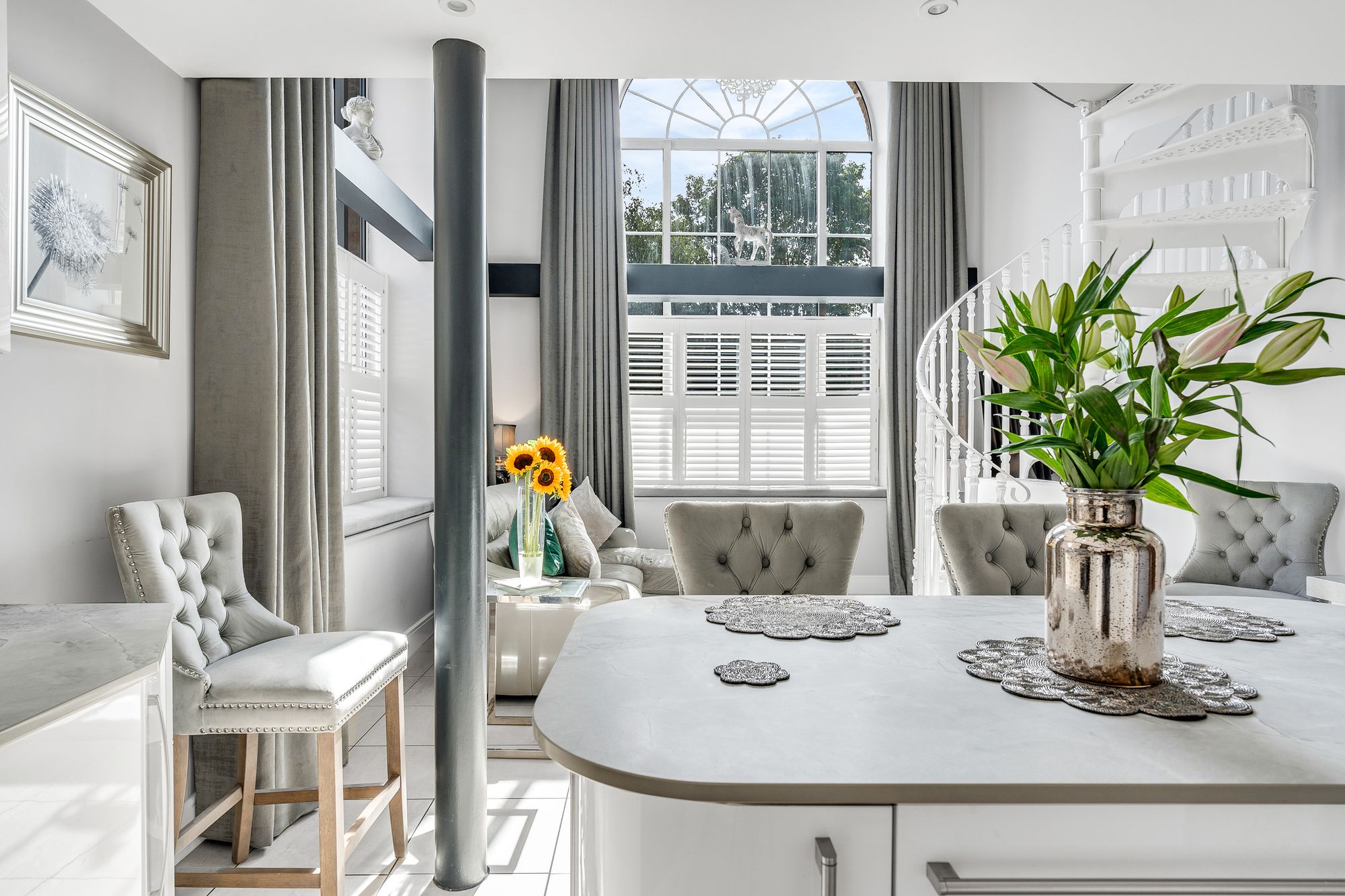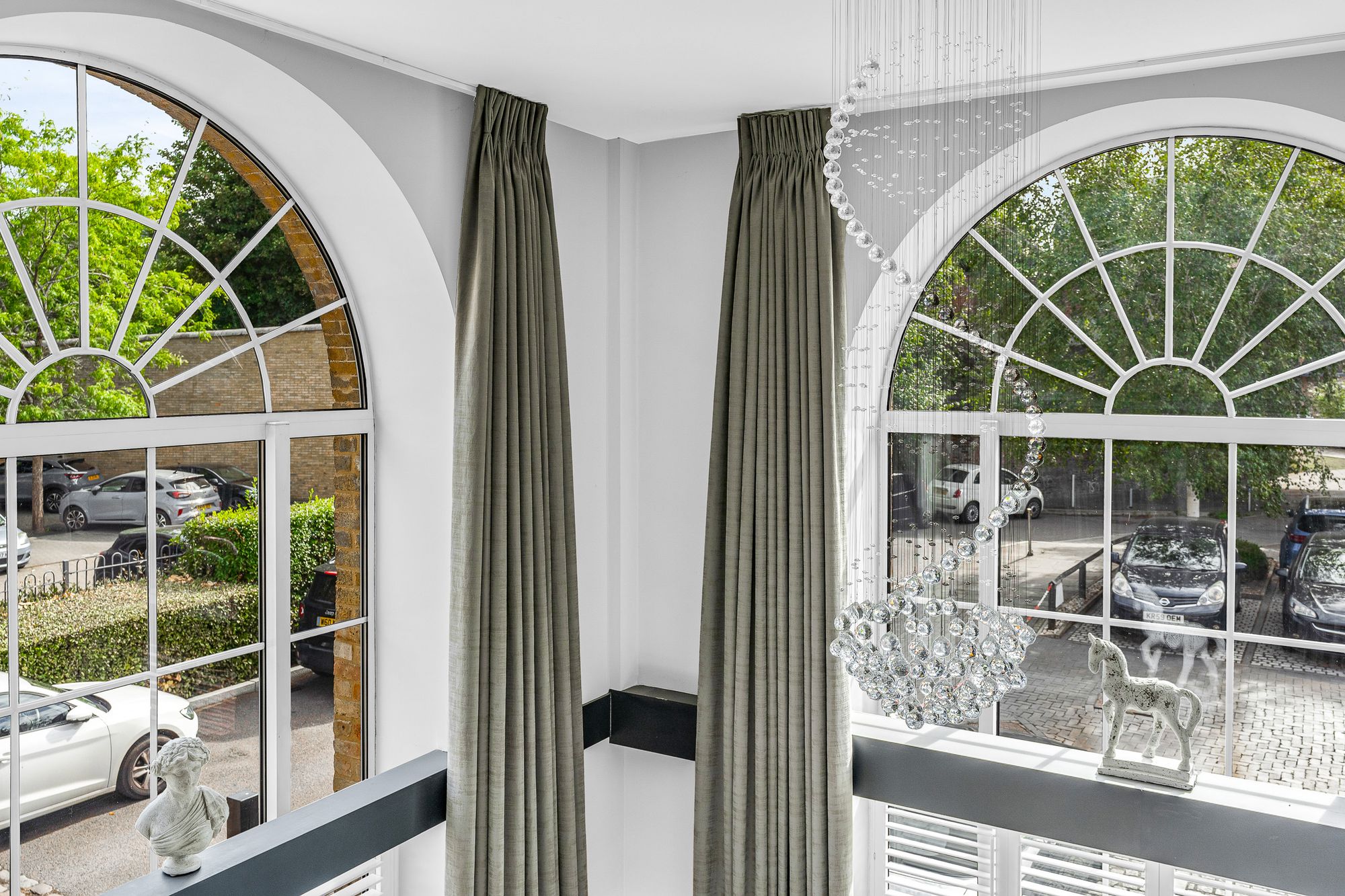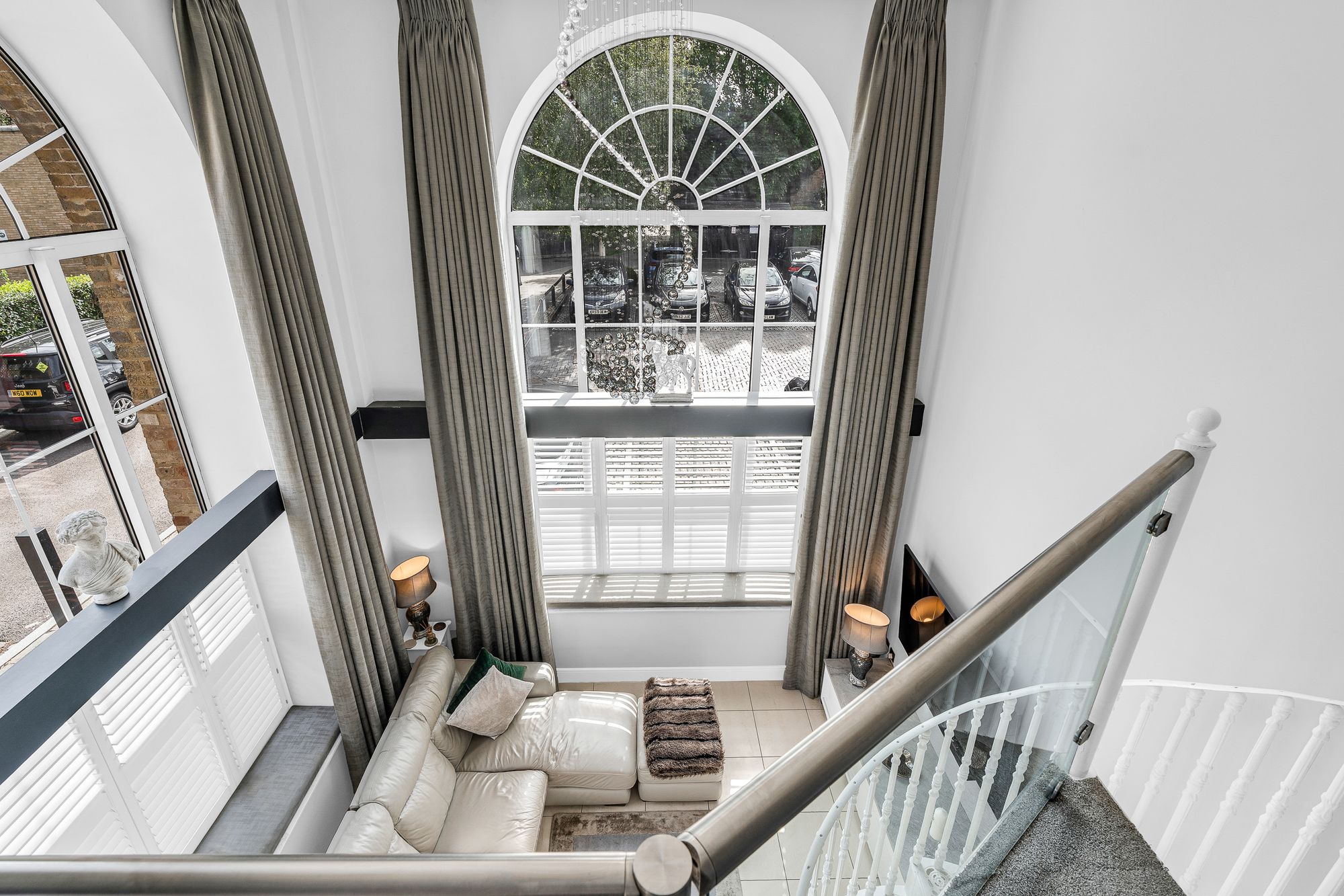 Dual aspect with two large arched feature windows with fitted shutters to half height, tiled flooring, spiral staircase to: