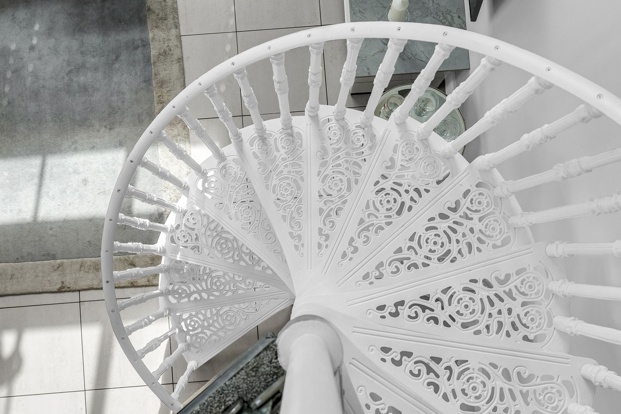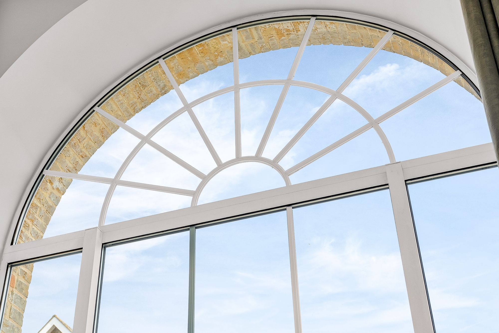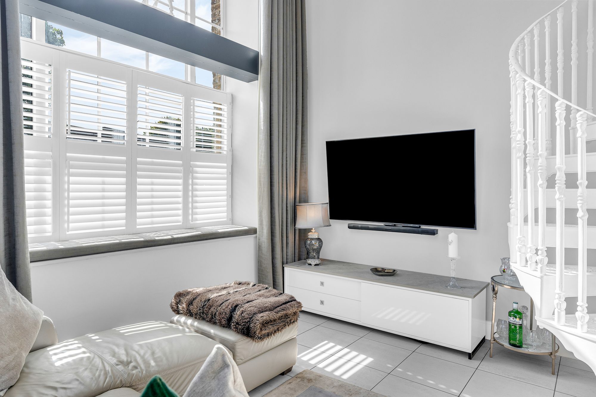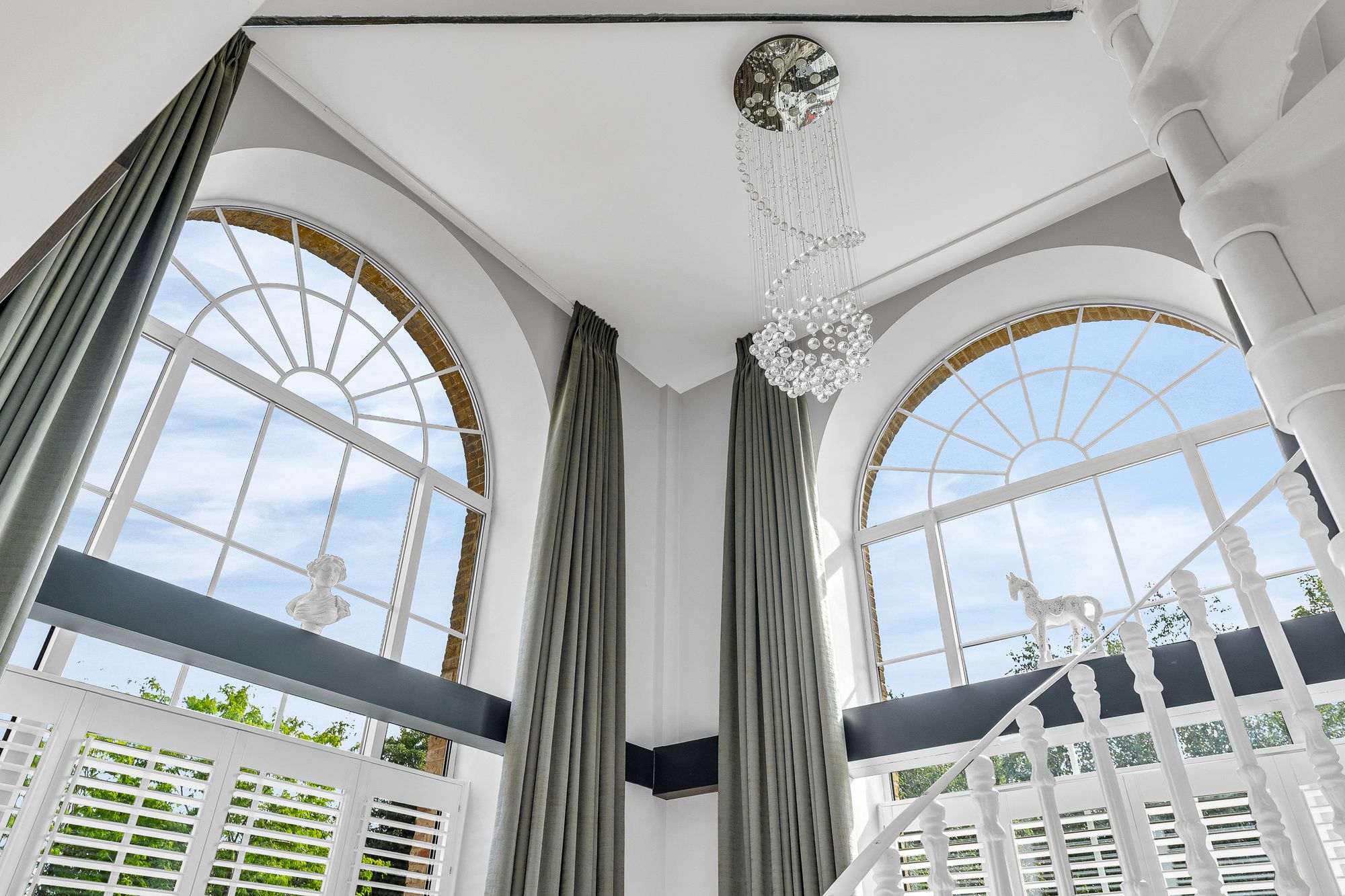 Dual aspect with two large arched feature windows with fitted shutters to half height, tiled flooring, spiral staircase to:
