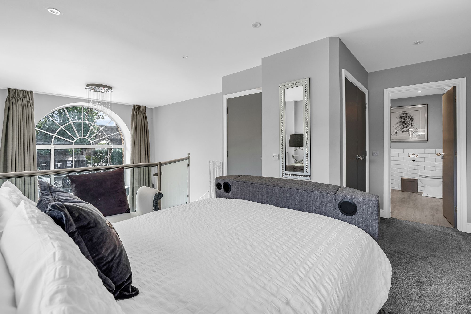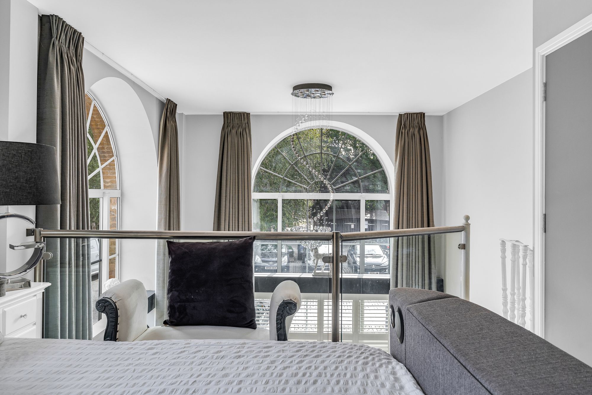With mezzanine balcony, half moon feature window, built-in wardrobes, storage cupboard with further hanging space. Door to: