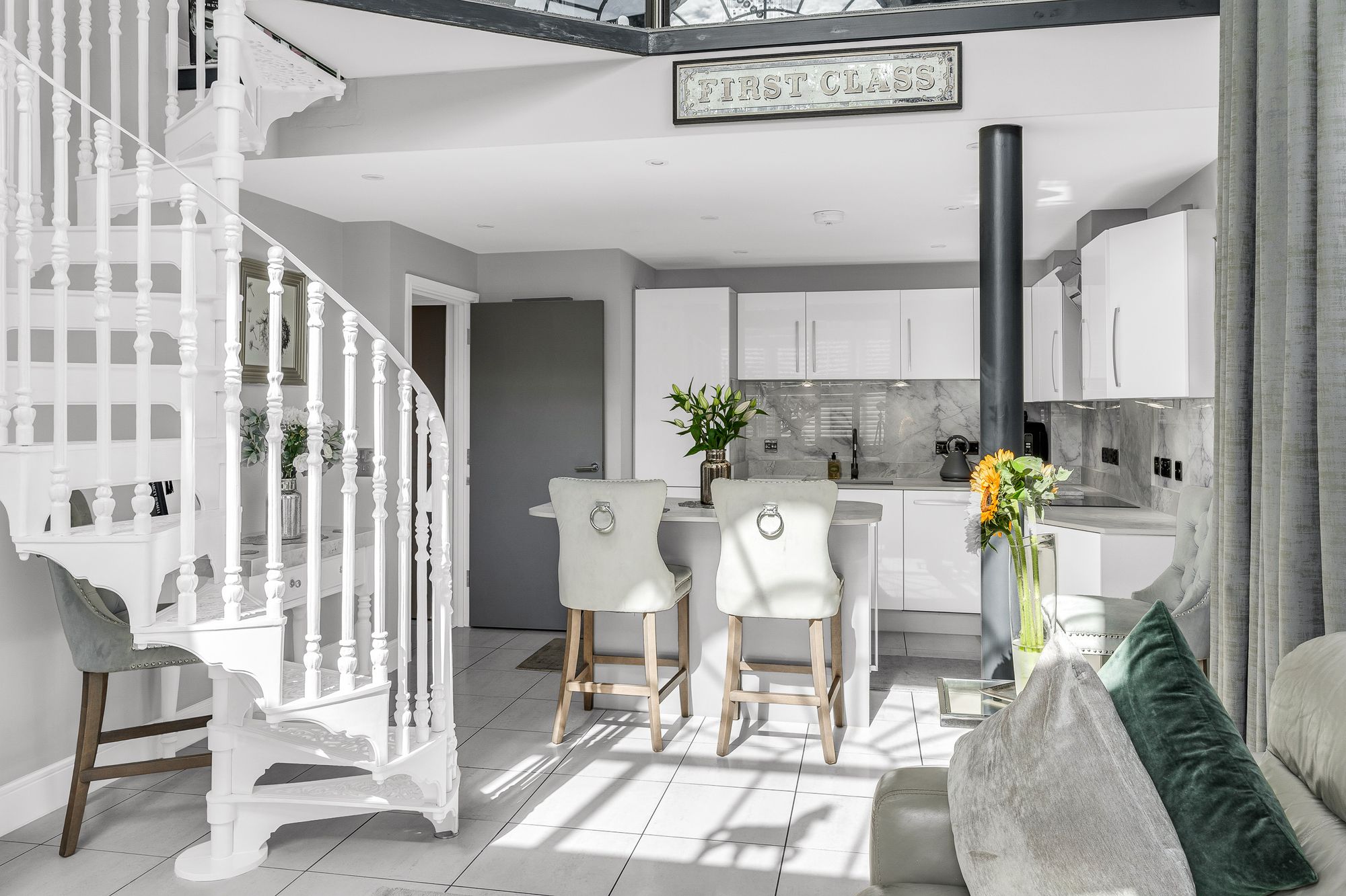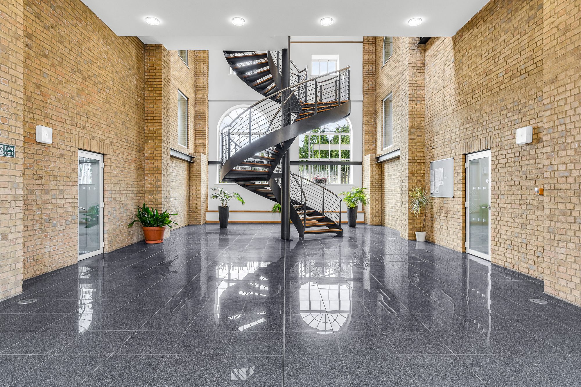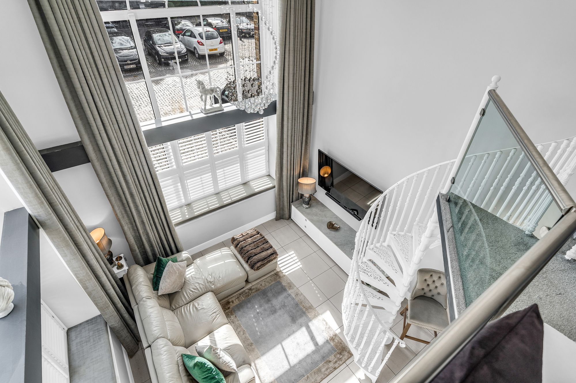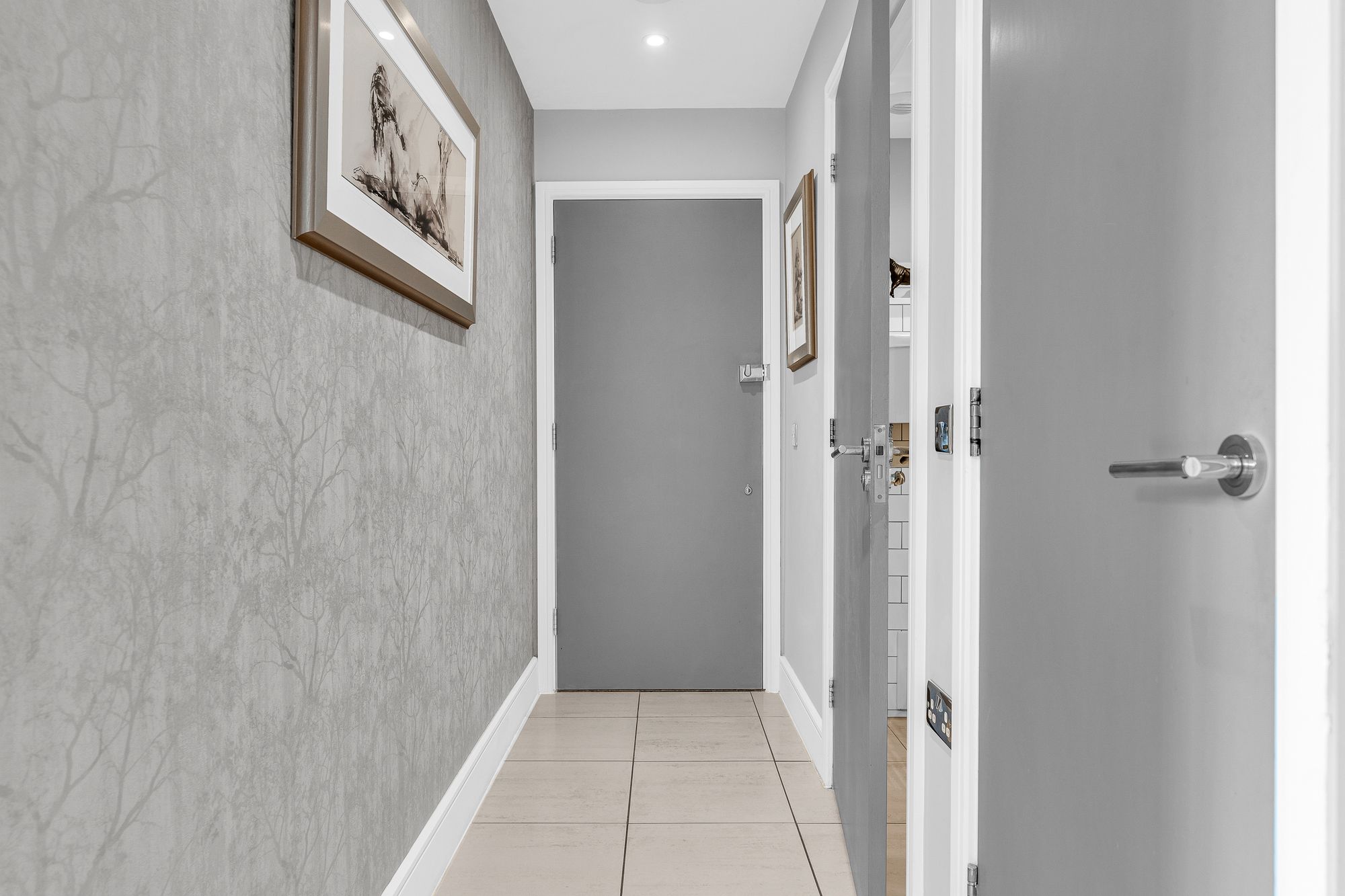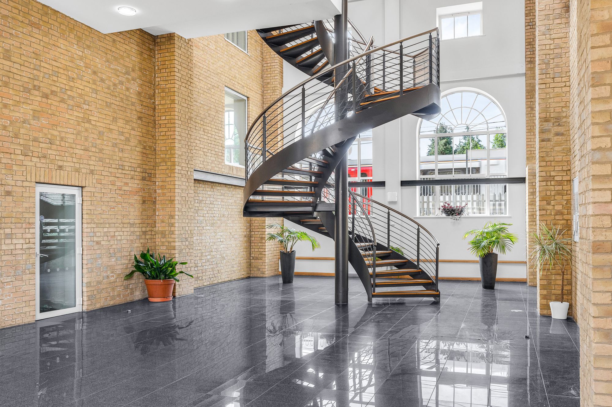 Stunning communal entrance with spiral staircase, large skylights, exposed brickwork and high quality gloss porcelain tiled flooring, security entryphone system. Private front entrance door to: