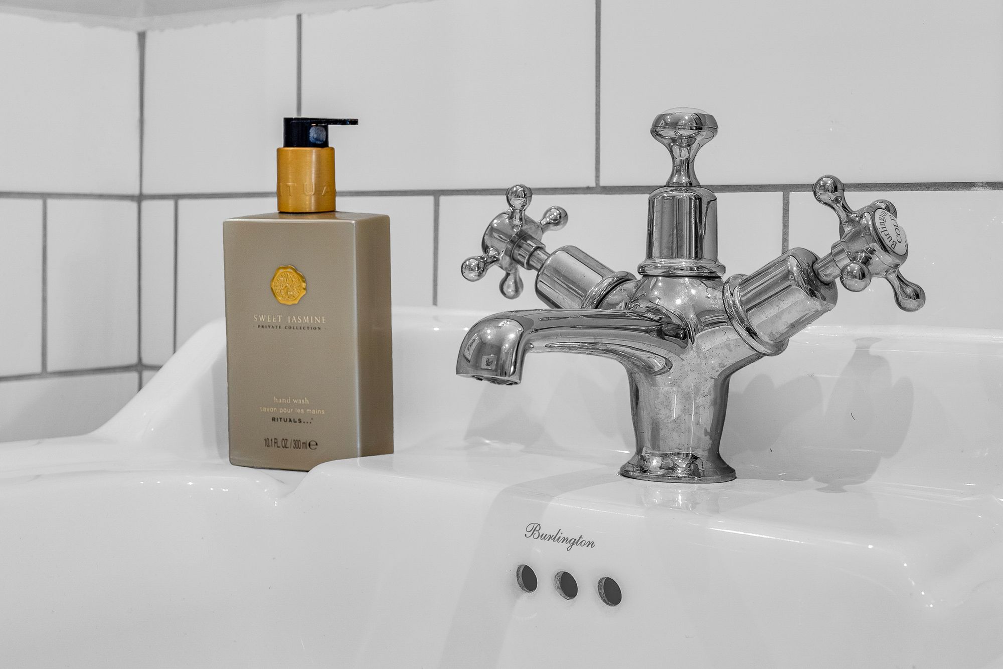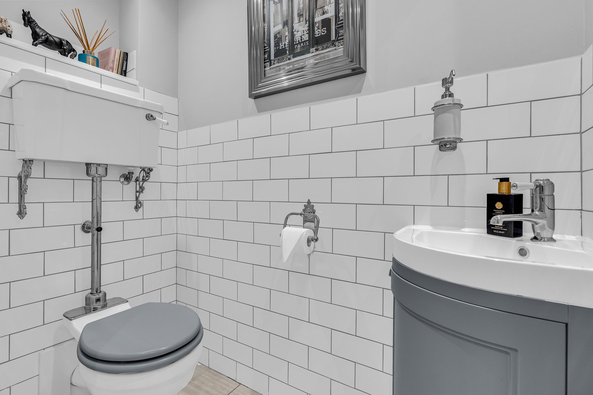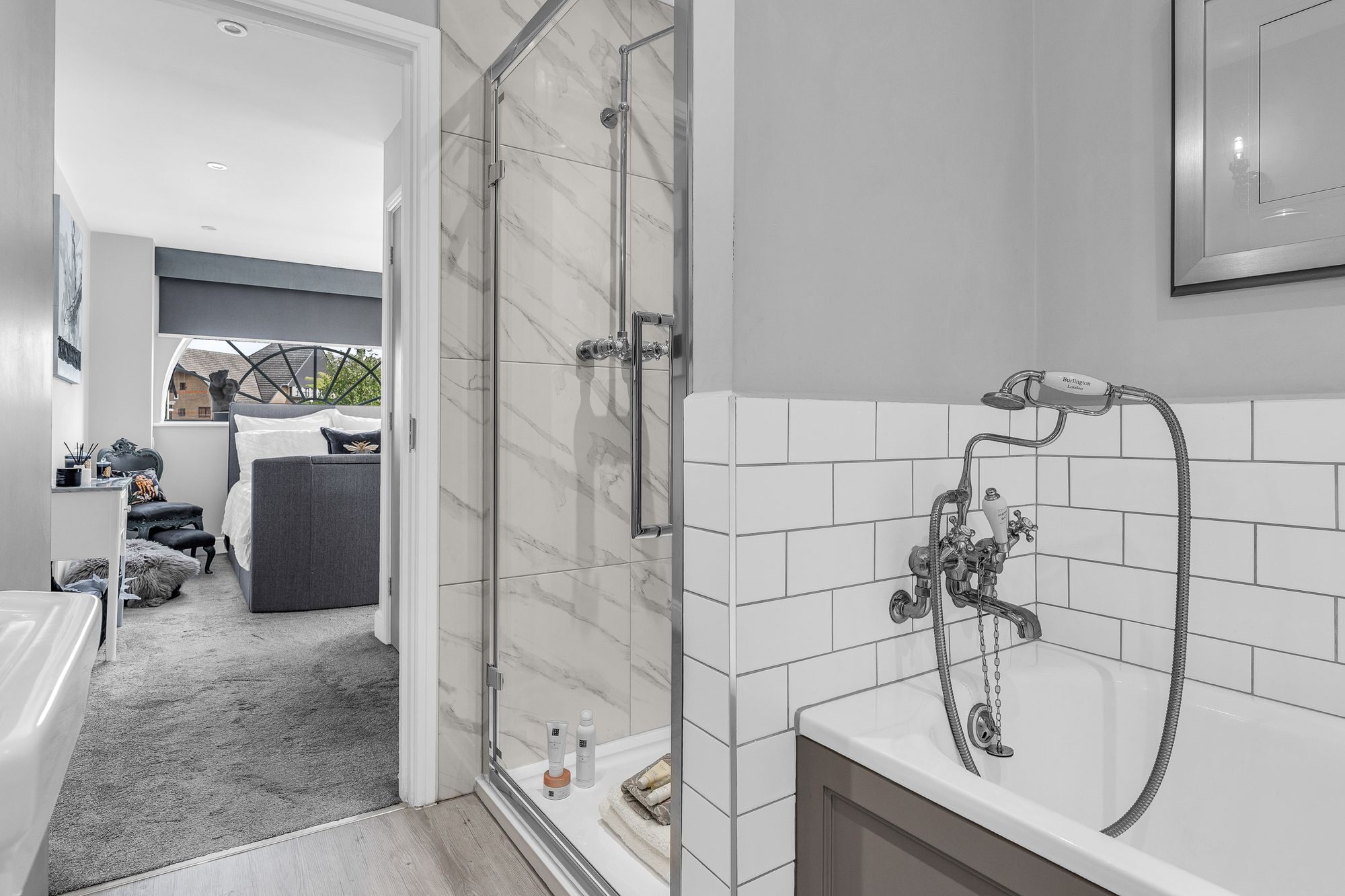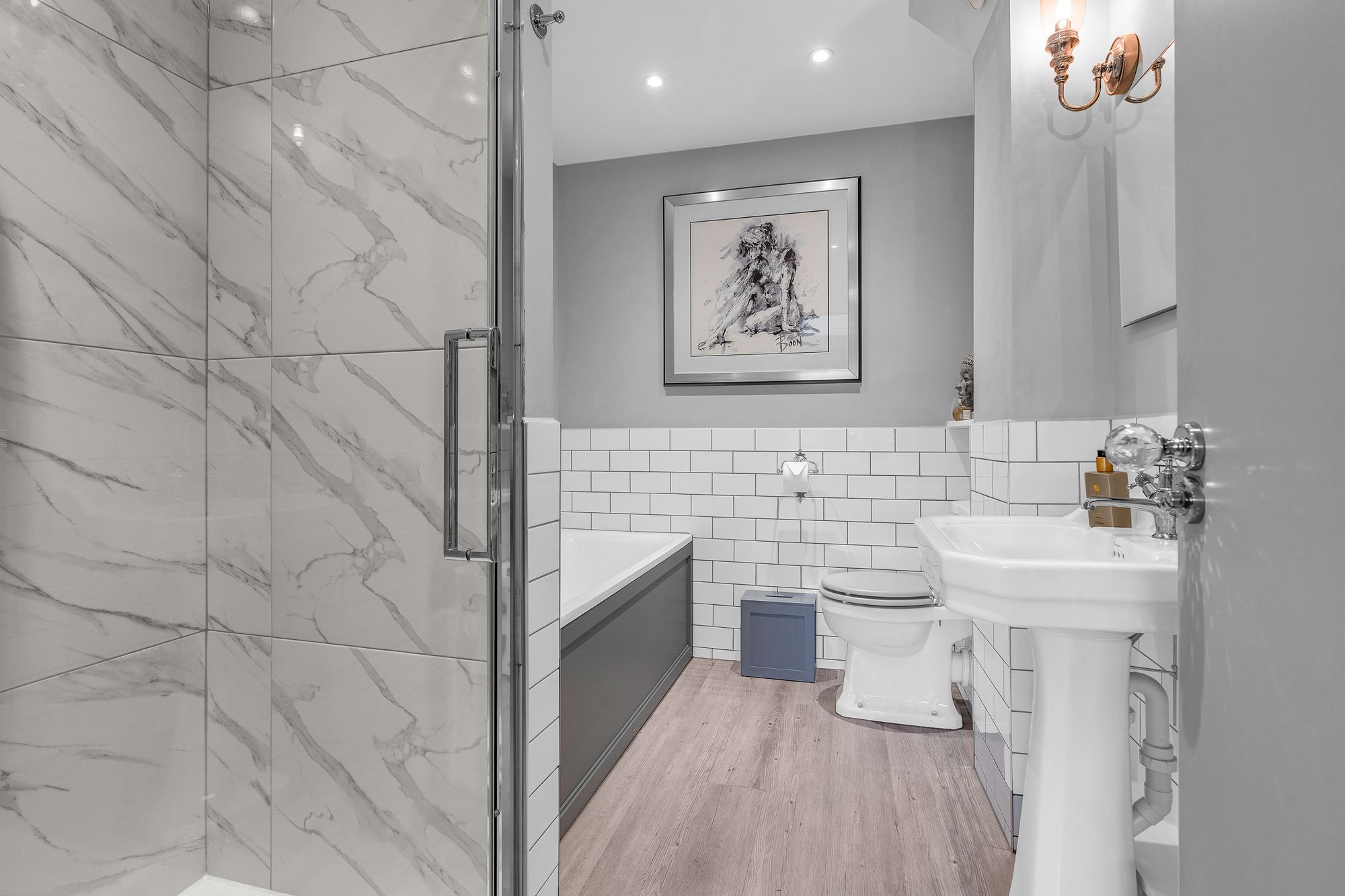 Fitted with a suite comprising low flush w.c., panel enclosed bath, separate shower cubicle, pedestal wash basin, tiled splash back areas, wood effect flooring.
