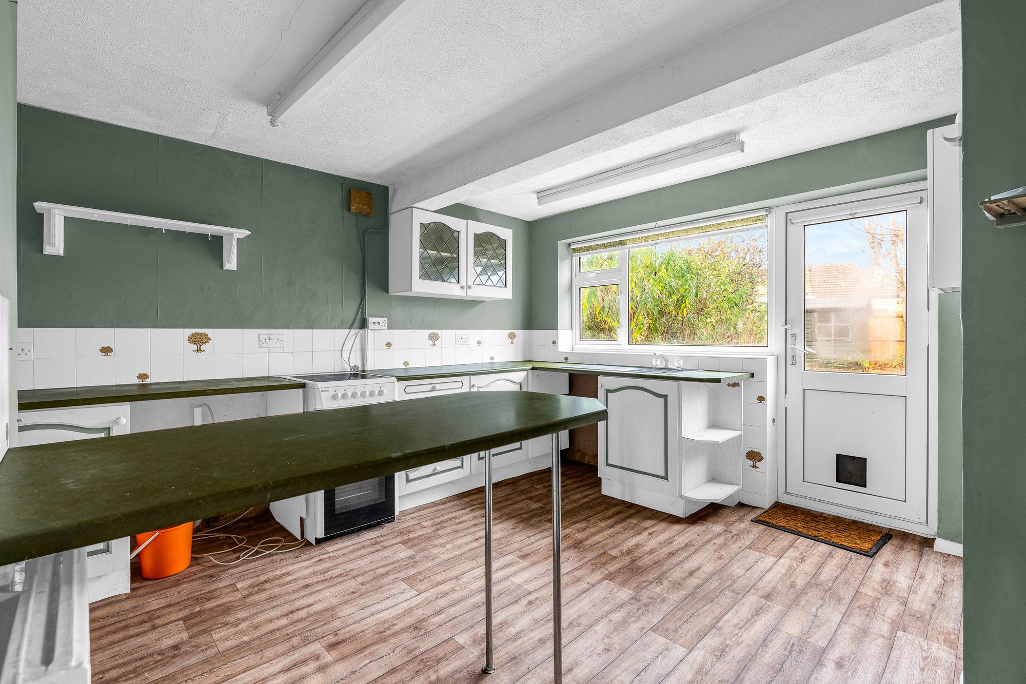 With double glazed window and door to the rear garden. Fitted with a range of wall and base storage units with work surfaces over incorporating a sink and drainer unit, appliance space, tiled splash back areas, wall mounted boiler, wood effect flooring, radiator.